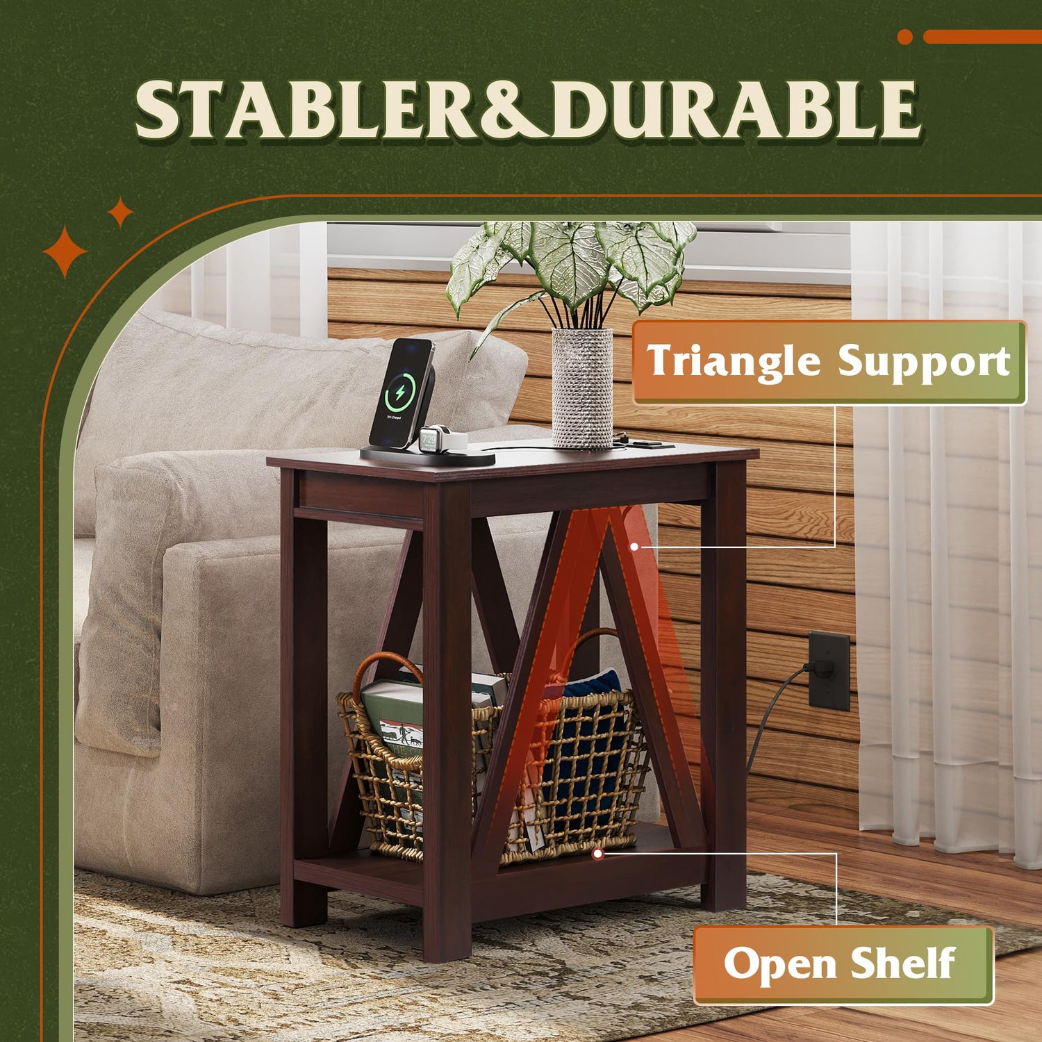 WLIVE Narrow End Table with Charging Station of Open Storage Shelf,Sofa Side Table with 2 USB Ports and 2 Power Outlets,Slim Farmhouse End Table for Small Spaces,Bedroom, Living Room, Espresso