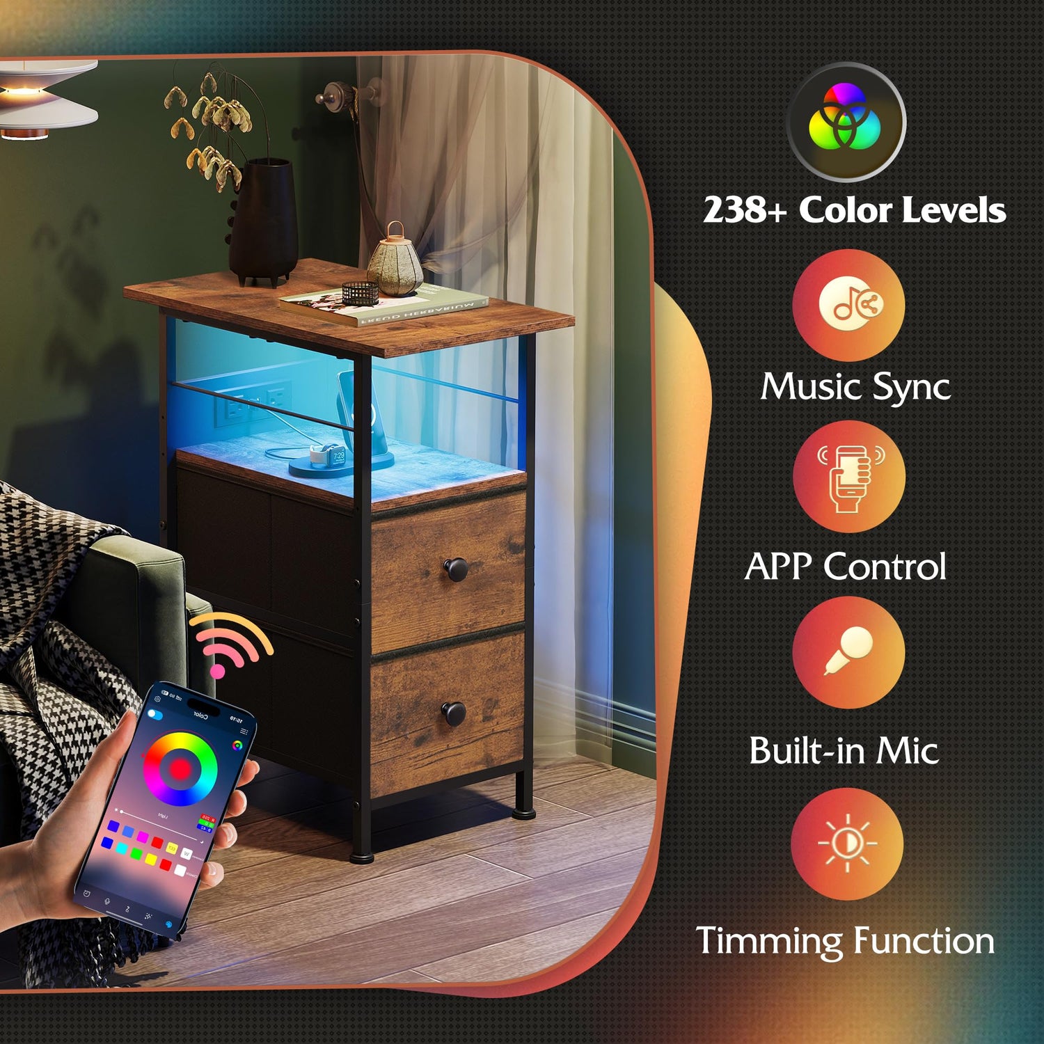 - 【Versatile Usage】This LED side table features 2 fabric drawers and one open shelf, which includes charger station. You can place this couch table beside your living room sofa, and it can also serve as a nightstand in the bedroom, effectively meeting your storage and power needs. Additionally, the LED light strip comes in various colors, creating a wonderful indoor atmosphere. This product also fits well with other home furniture.
