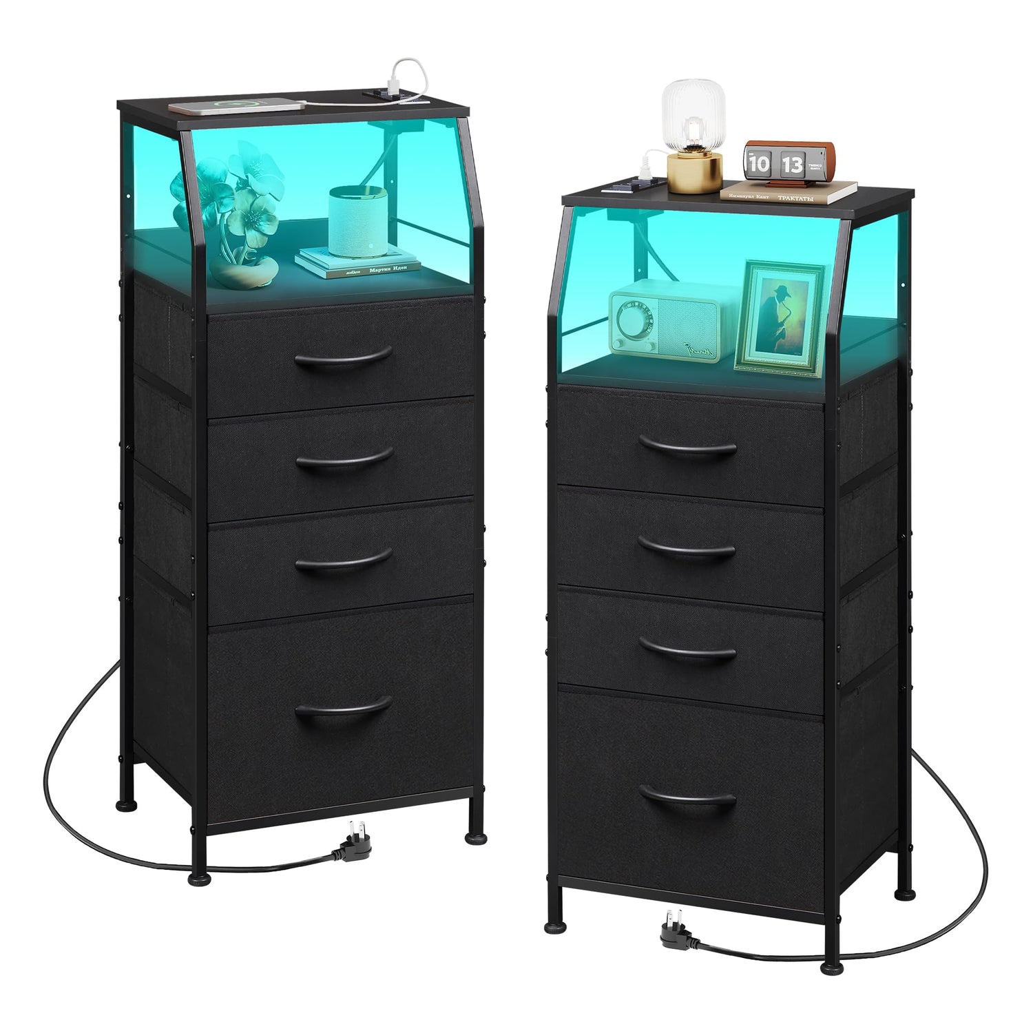 WLIVE Night Stand Set of 2 with Charger Station, Nightstand Sets with LED Light and 4 Storage Drawers, Tall Dressers for Bedroom, Bedside Tables with Fabric Bins, Wood Shelf, Metal Frame, Black