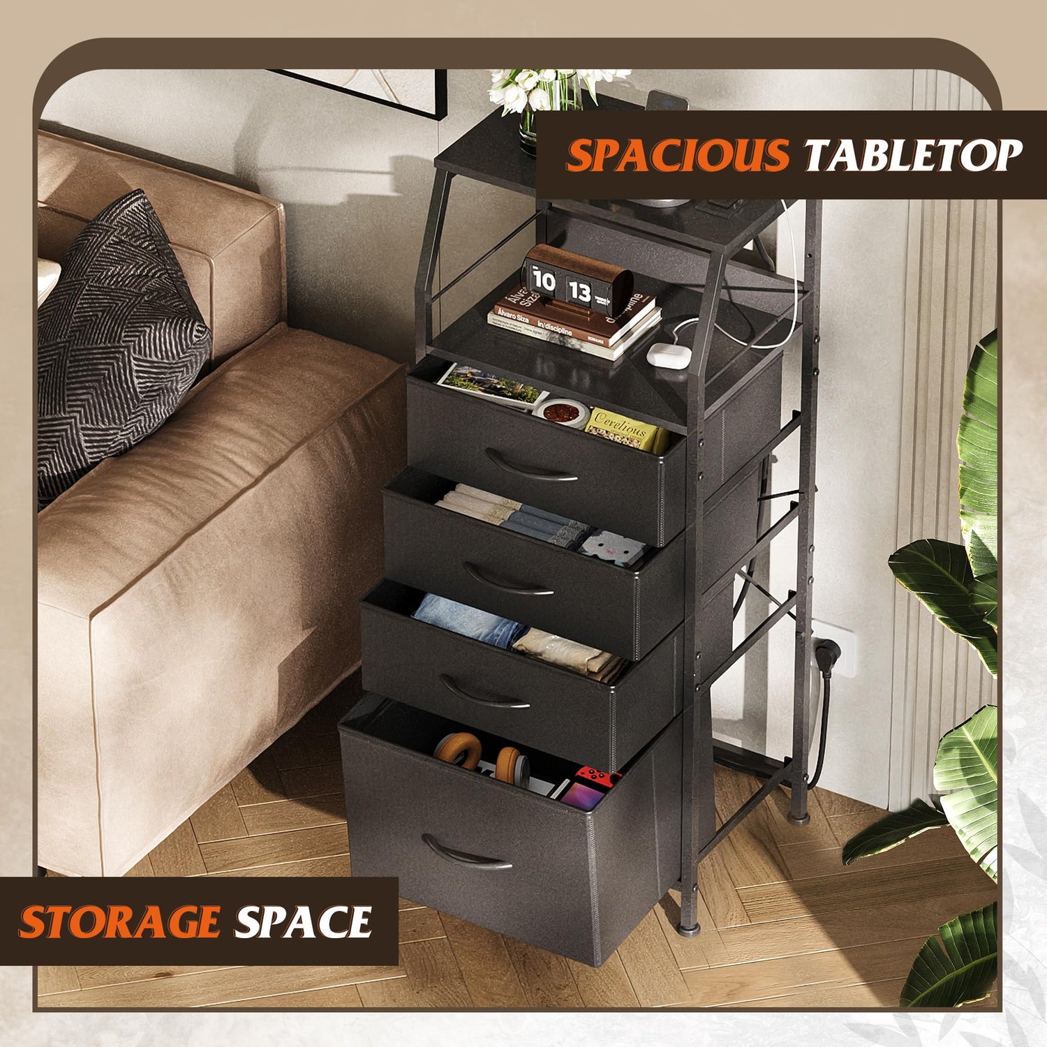 - [4 Drawer Storage Space]: This tall nightstand with charging station features 4 spacious fabric drawers that are stylish, breathable, and easy to maintain. The fourth drawer provides more storage space compared to the previous three drawers, allowing you to better organize and store your belongings according to your needs. Additionally, two open wooden shelves offer extra storage space, making them an ideal choice for electronic devices, clocks, coffee mugs, or decorative items.