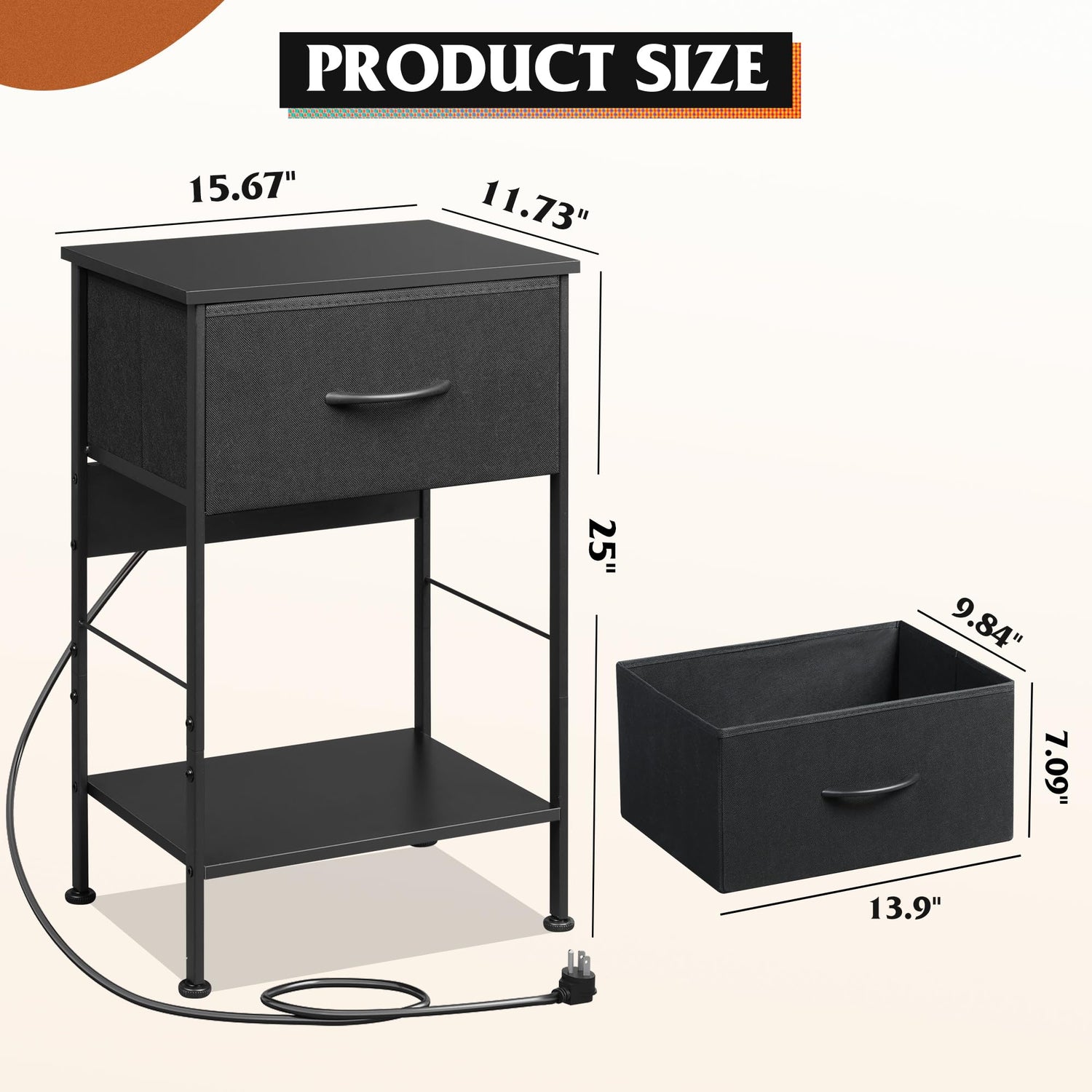 WLIVE Night Stand with Charger Station, Small Nightstand with 1 Fabric Drawer and Open Wood Shelf, 25" H Bedside Table for Bedroom, 2-Tier Storage Side Table for Dorm, Entryway, Black