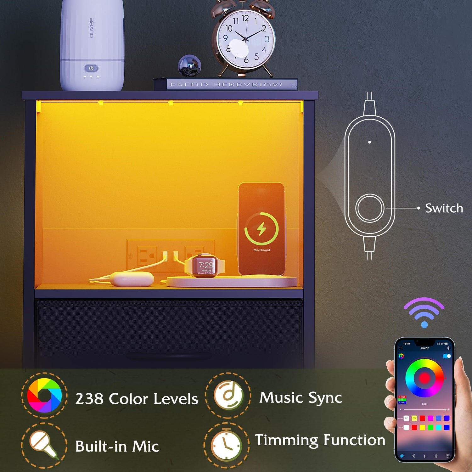 - [LED Nightstand] Enhance your bedroom with this night stand featuring a colorful LED light strip. You can control the color changes and turn the lights on or off using your phone's app and key control. The brightness of the bedside table is adjustable, allowing you to create a soothing atmosphere that helps you relax and drift off to sleep peacefully.