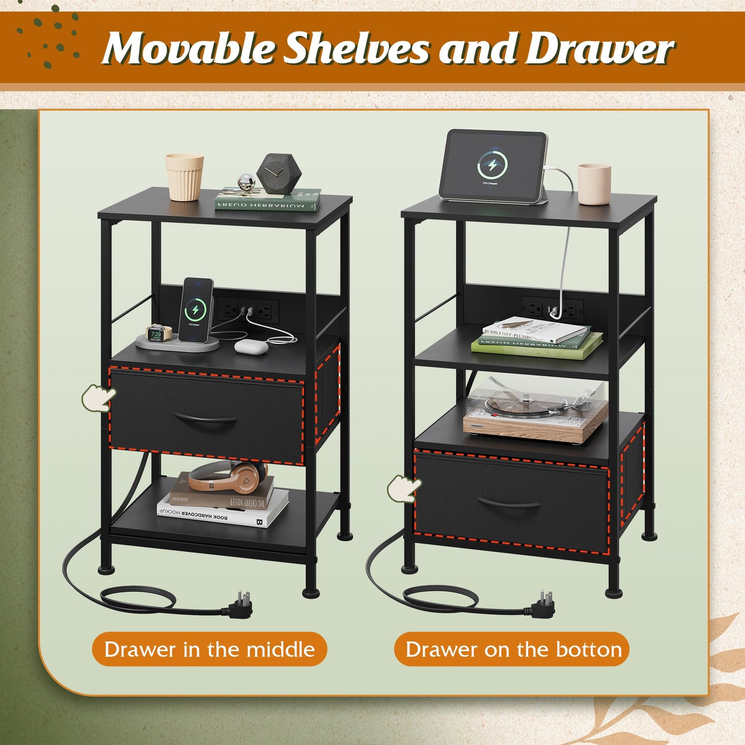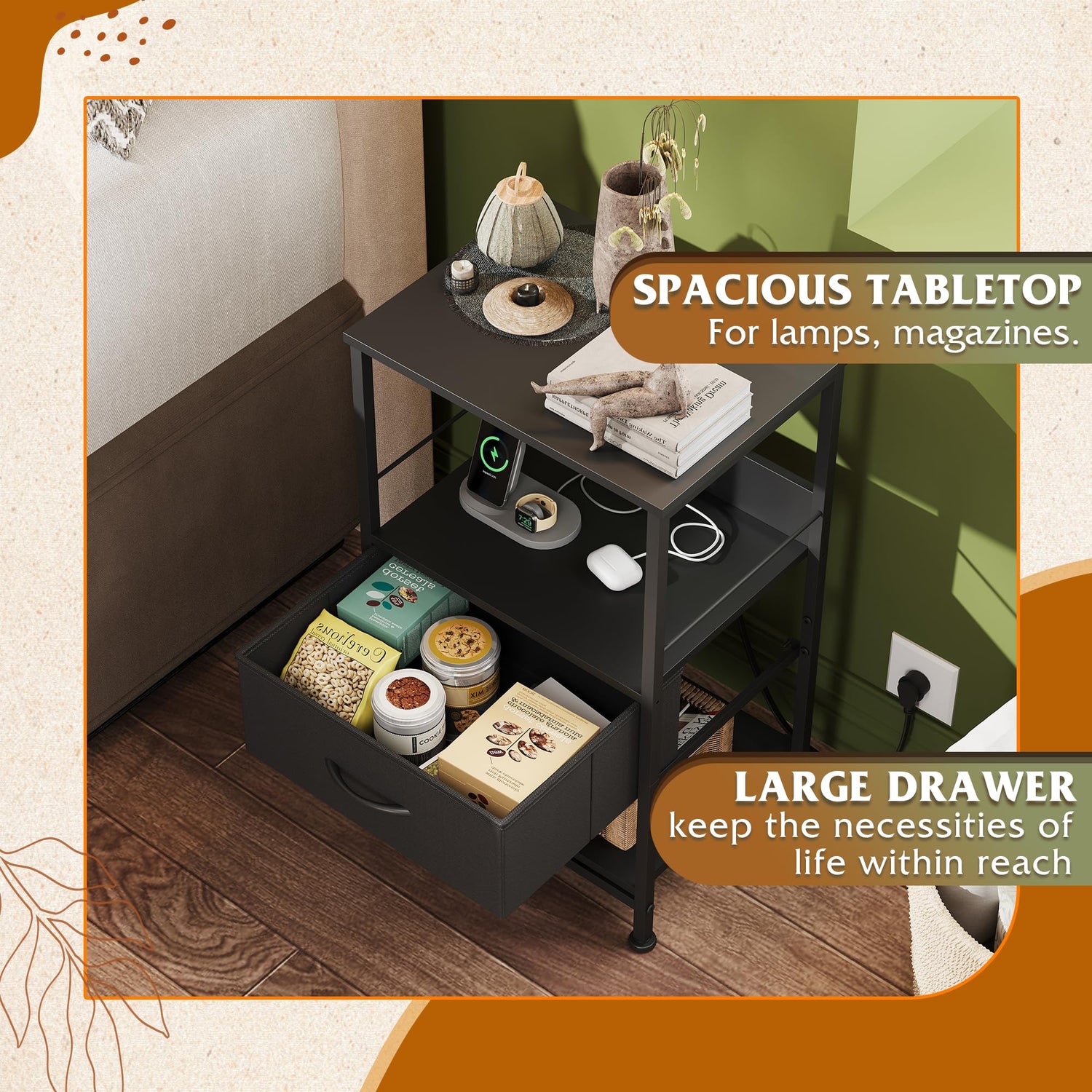 - [Spacious Storage] This black nightstand includes 1 fabric drawer that provide ample storage while maintaining your privacy. The open shelves are perfect for displaying a lamp or books, adding a decorative touch to your room. With this functional bedroom furniture and charging station, you'll keep your essentials within easy reach.