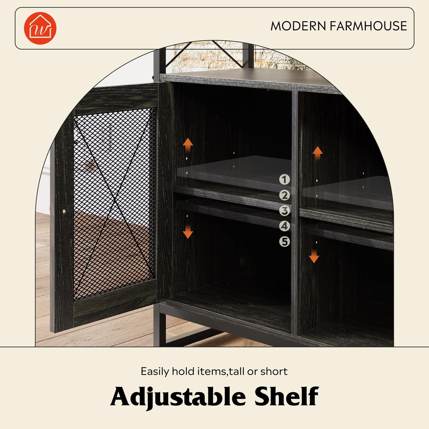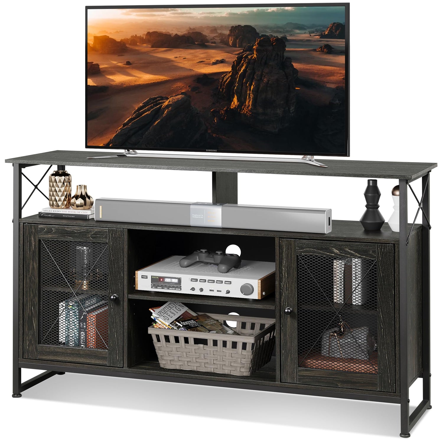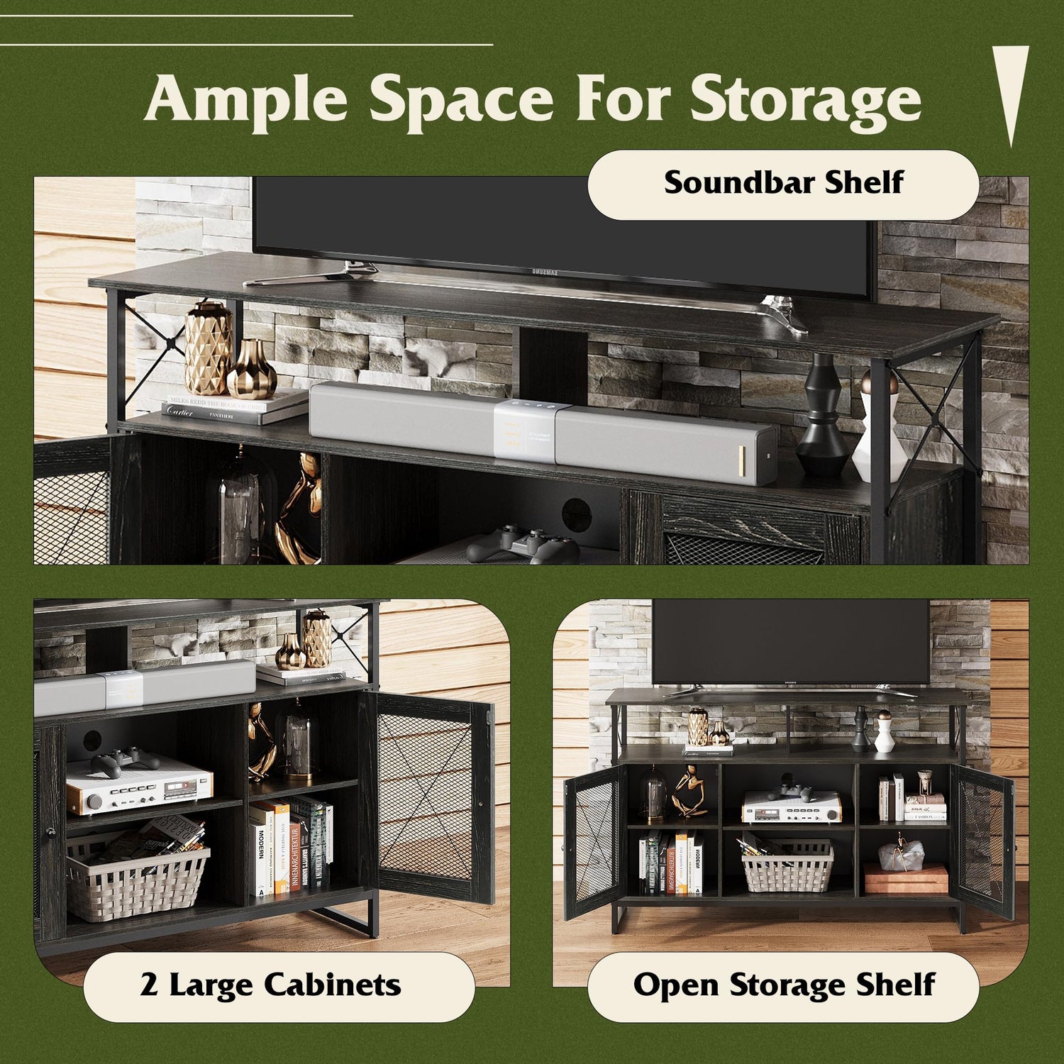 - 【Tall TV Stand with Storage】Top Semi-open shelf for sound bar storage. two industrial-inspired mesh doors on either end opens to give you an ample space to display your DVDs and board games, while the central shelves are ideal for media players and consoles.