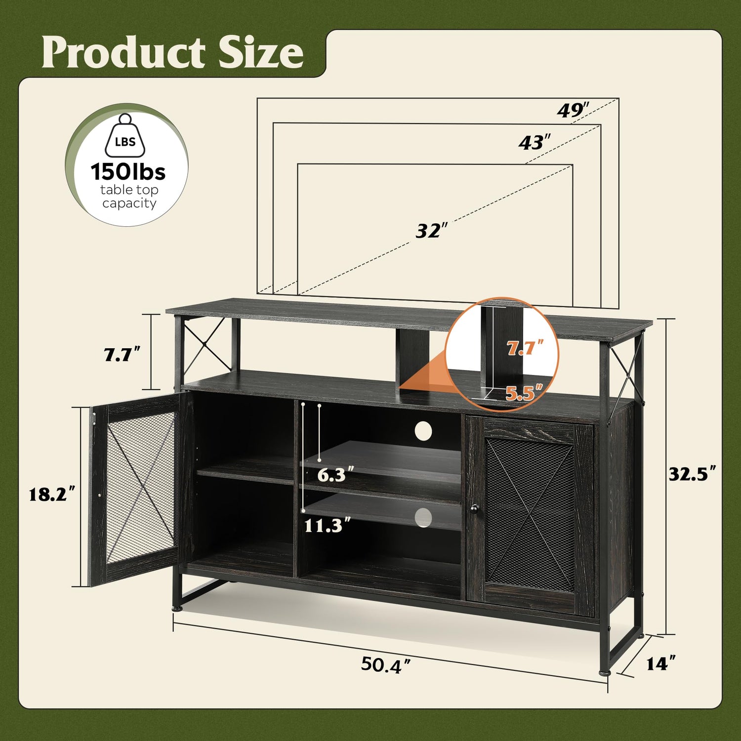 - 【Not Wobble& High Weight Capacity】The entertainment center with steel frame legs give you the extra stability and sturdiness, the maximum load capacity of 150 pounds and measures 50.4" W x 14" D x 32.5" H. This TV stand is suitable for 43/50/55 inch TV.