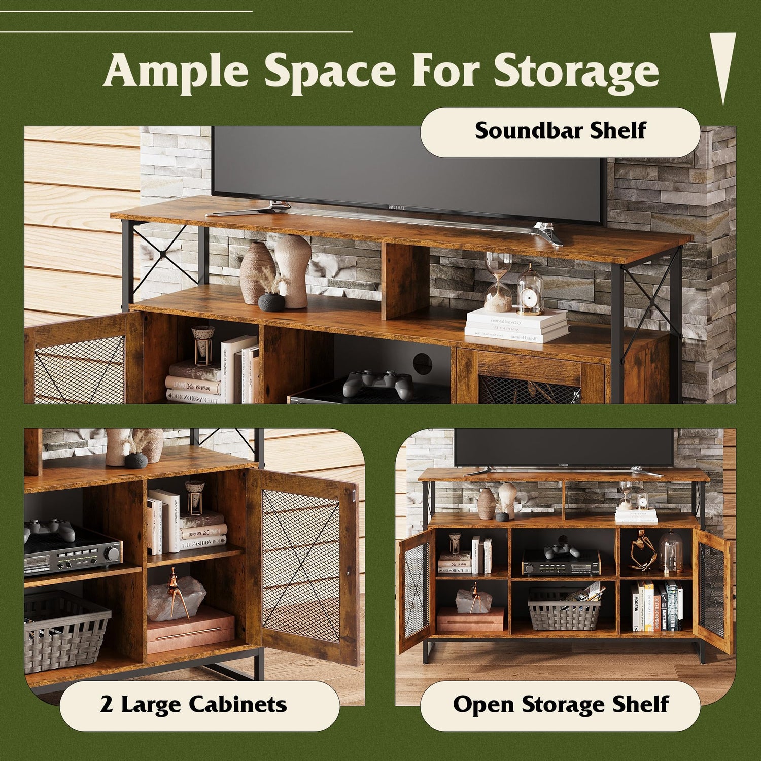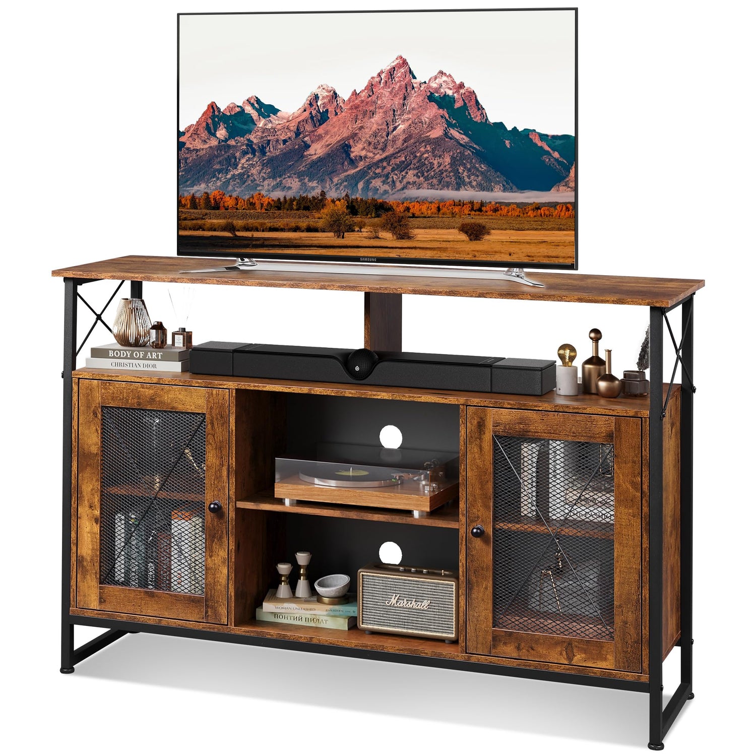 - 【Tall TV Stand with Storage】Top Semi-open shelf for sound bar storage. two industrial-inspired mesh doors on either end opens to give you an ample space to display your DVDs and board games, while the central shelves are ideal for media players and consoles.