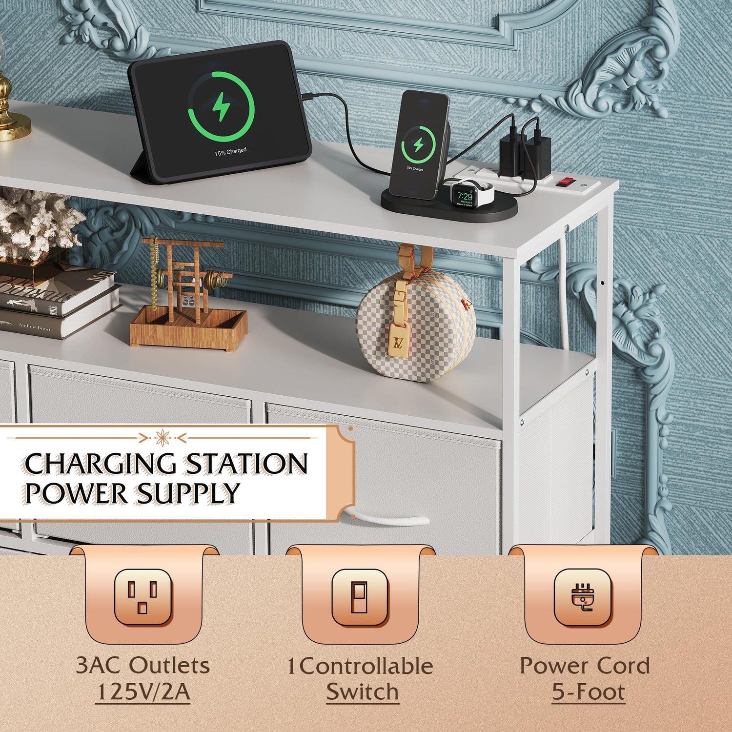 - Built-in Charging Station: This TV console features an open shelf with 3 AC outlets, providing power for your TV, sound system, WiFi, and more. The power strip includes a master switch for one-touch control of the power supply.