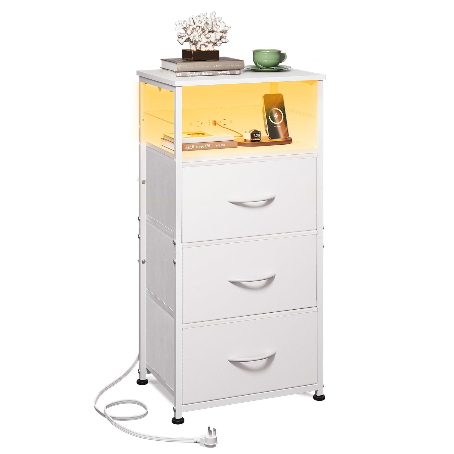 - [Easy to Assemble] This small end table with charging station comes with instruction and enough components, you can follow the steps to assemble it easily. Also, This fabric 3 drawer LED nightstand with charger station features a specially designed anti-tip device to prevent any accidents during use. If you meet any problems, please feel free to send messages to us.