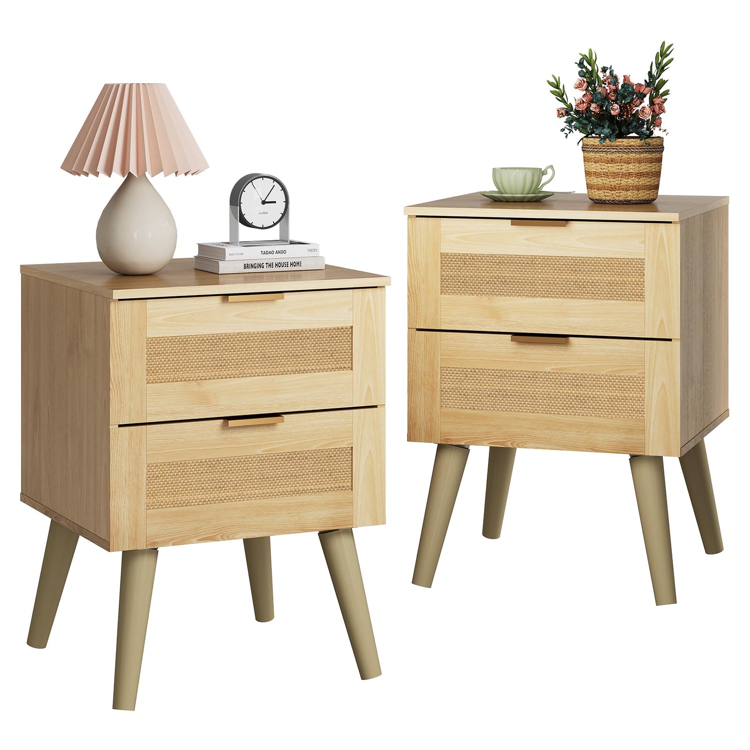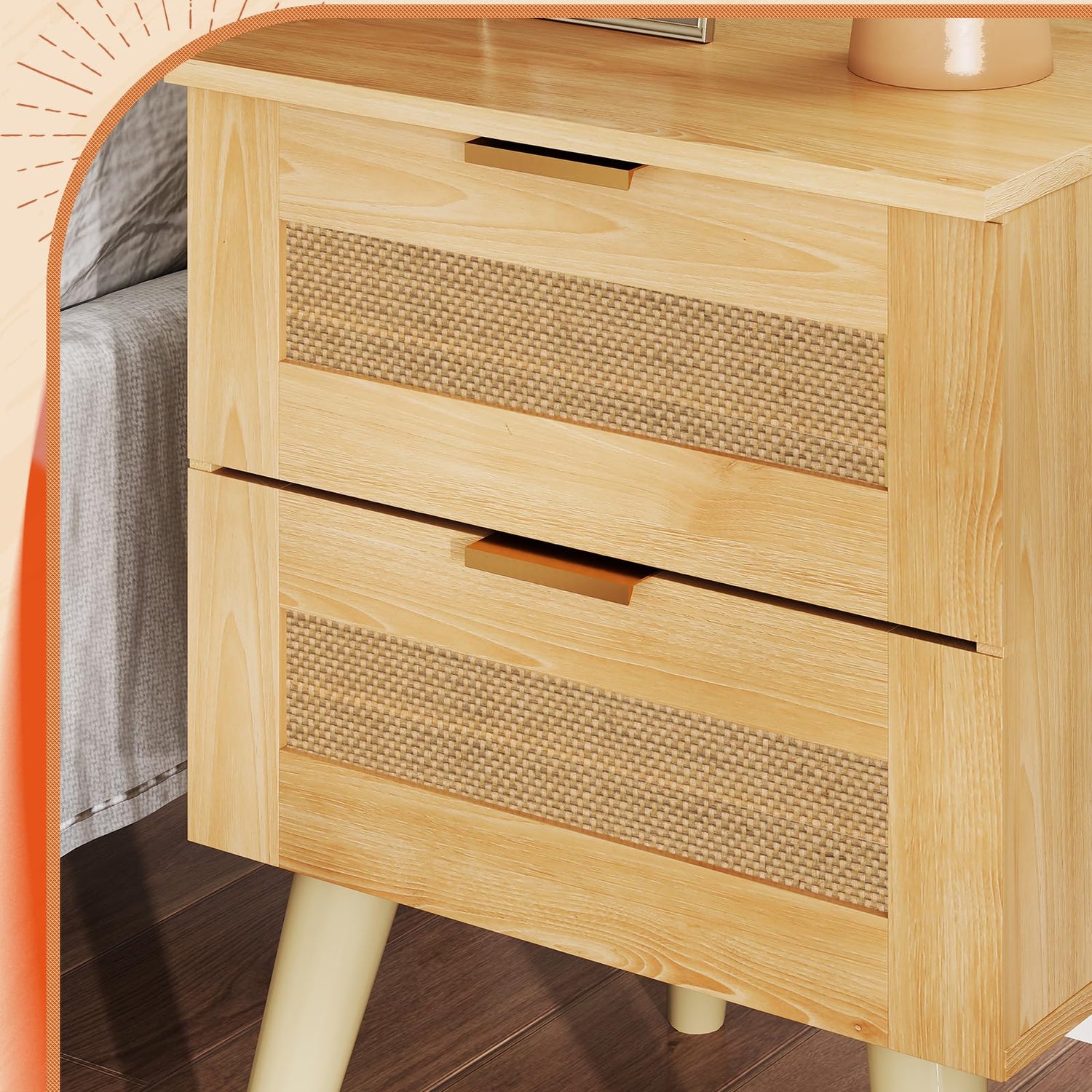 WLIVE Wood Nightstand Set of 2, Night Stand Sets with 2 Rattan Decor Drawers, End Tables with Solid Legs, Bed Side Table for Bedroom, Living Room, Natural Oak
