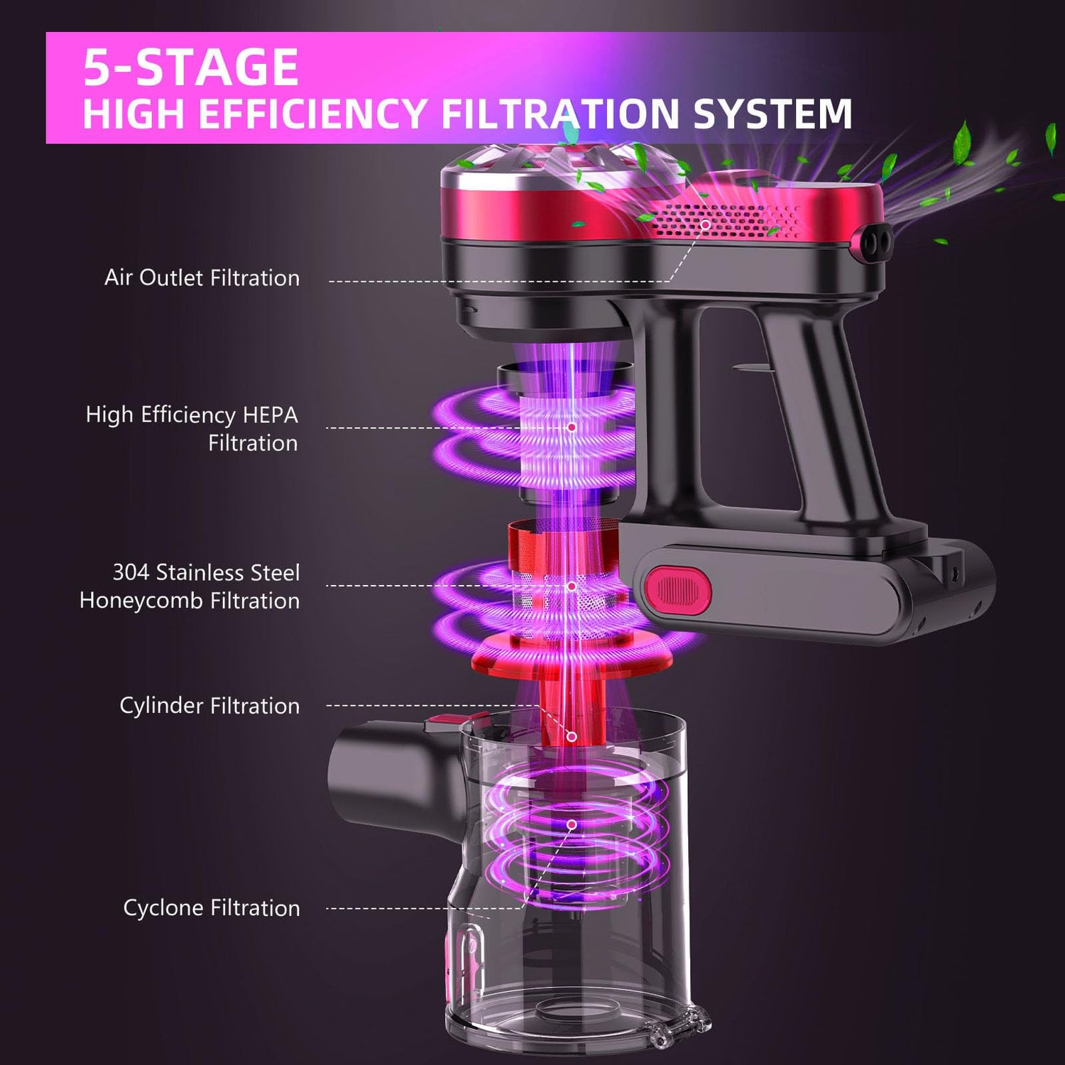 - HIGH-EFFICIENCY FILTRATION & LARGE-CAPACITY DUST CUP: The vacuum cleaner is equipped with a 5-stage HEPA filtration system that captures 99.99% of 0.3 micron-sized dust particles, ensuring cleaner air at home. Perfect for homes with pets! Washable and reusable filters make maintenance easy and eco-friendly, keeping your vacuum cleaner in top suction condition. Extra-large dust cup minimizes interruptions during cleaning. One-touch release mechanism allows for mess-free emptying, keeping your hands clean and dust-free.