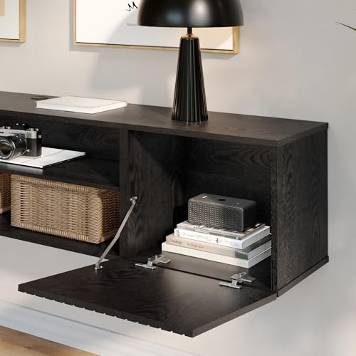 - Multi-Storage & Hidden Cabinet: The Wampat wall-mounted floating entertainment center features two spacious storage compartments and an integrated 36" electric fireplace. The open shelving and hidden flip door design offer ample space for TV components, gaming accessories, and books, while maximizing storage efficiency compared to traditional drawers.