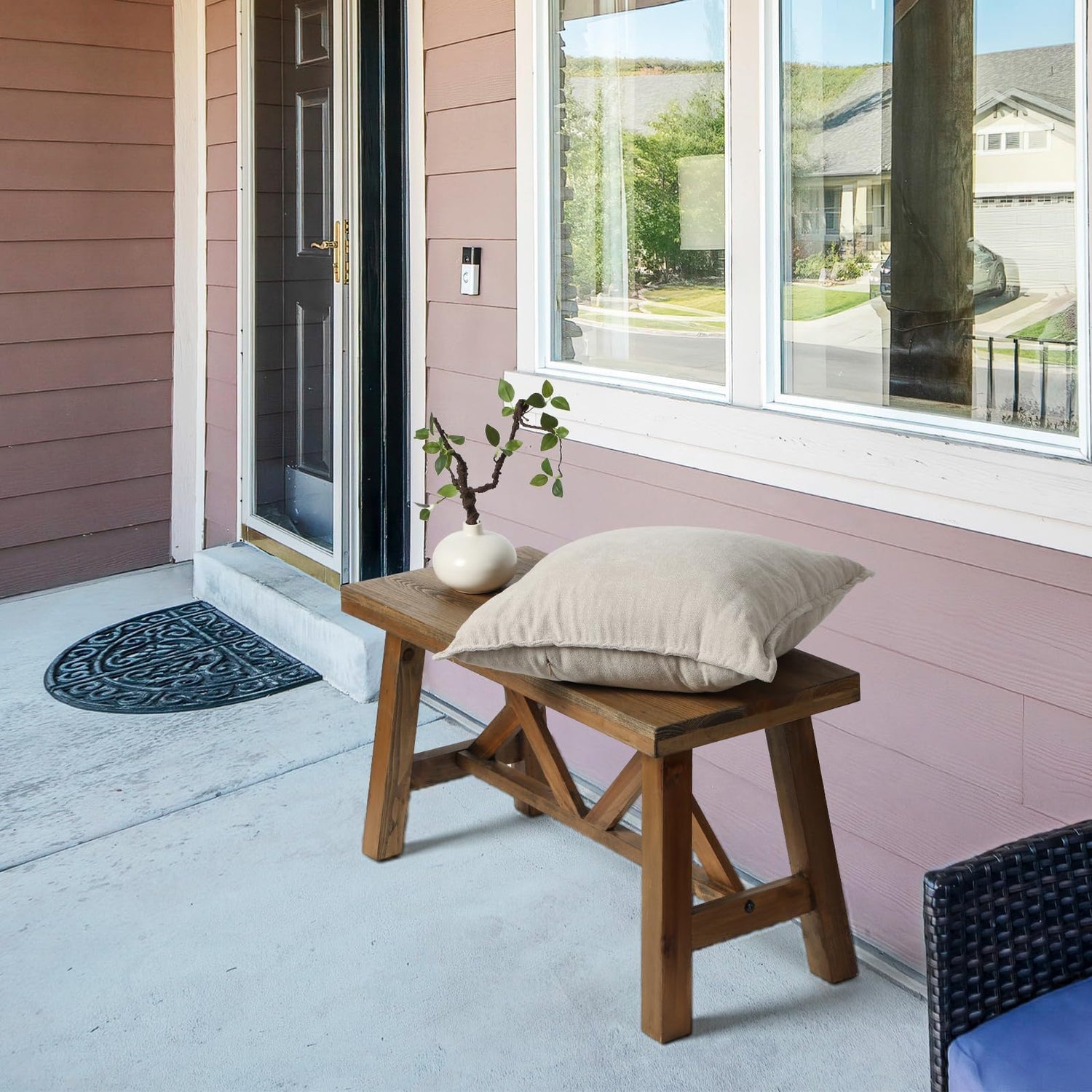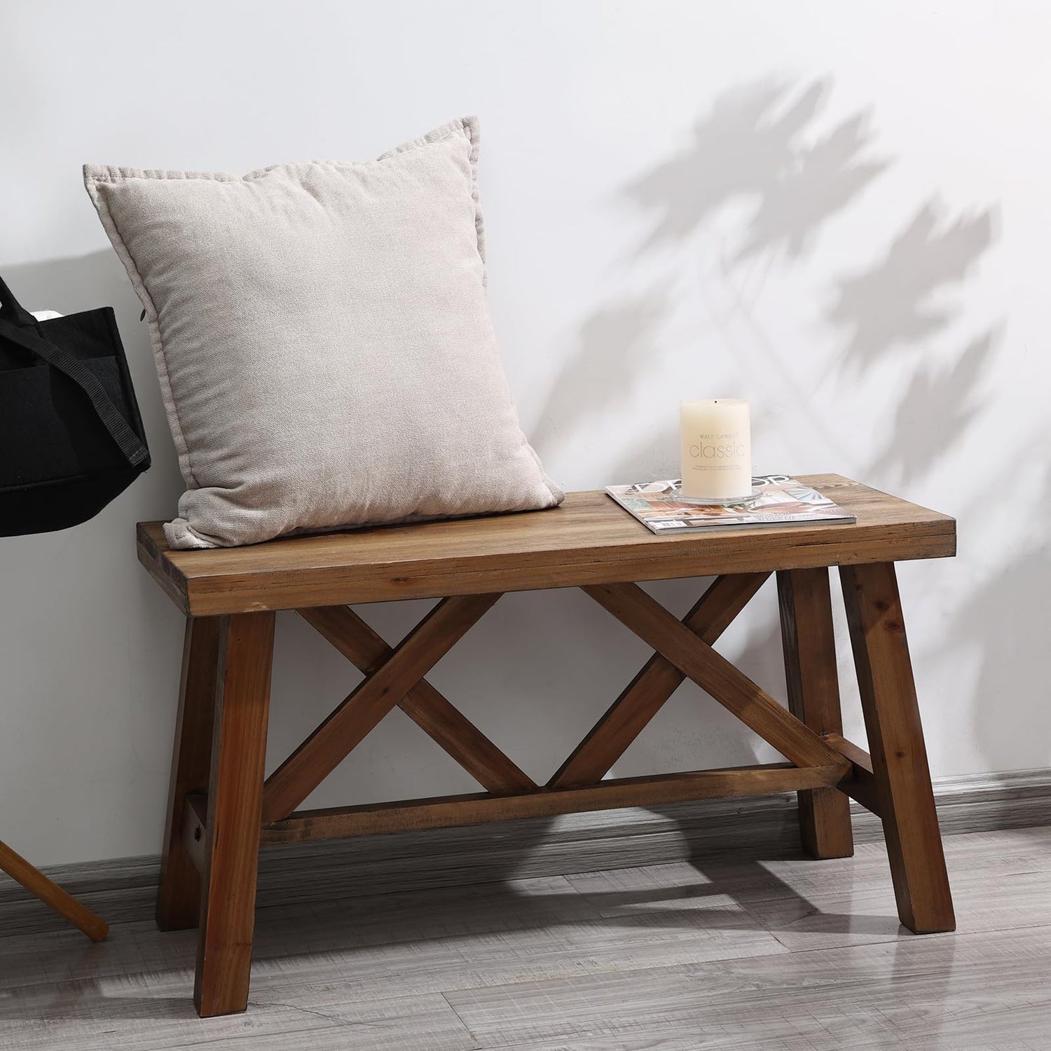 - 【Small Wood Bench】This wooden bench seat has Double X-Structure farmhouse design that can be amplified by cushion pillows and woven fabric. So take a load off and relax on this decorative bench. A small piece of furniture that make a big difference to give your home an instance refresh