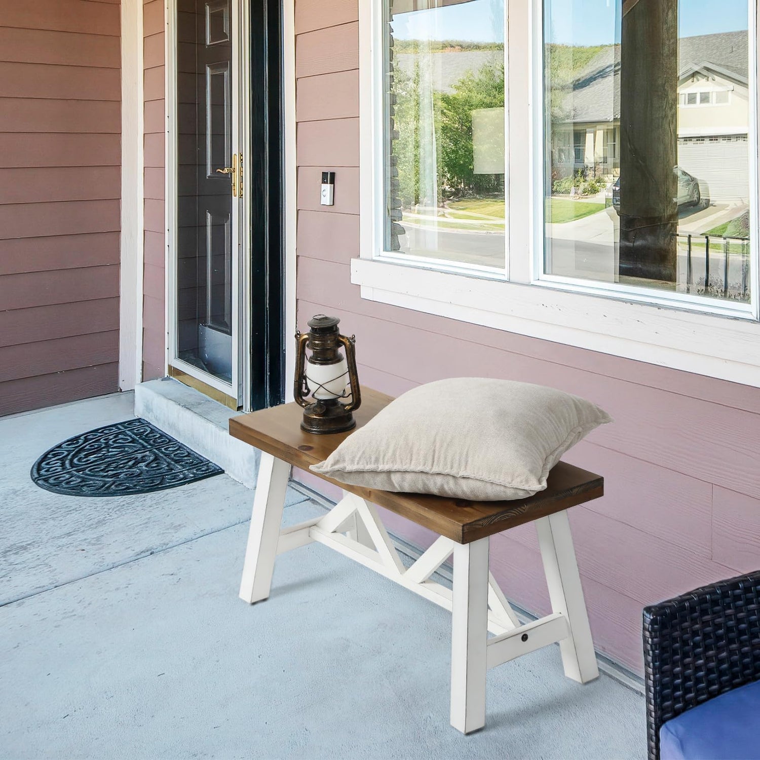 - 【Small Wood Bench】This wooden bench seat has Double X-Structure farmhouse design that can be amplified by cushion pillows and woven fabric. So take a load off and relax on this decorative bench. A small piece of furniture that make a big difference to give your home an instance refresh