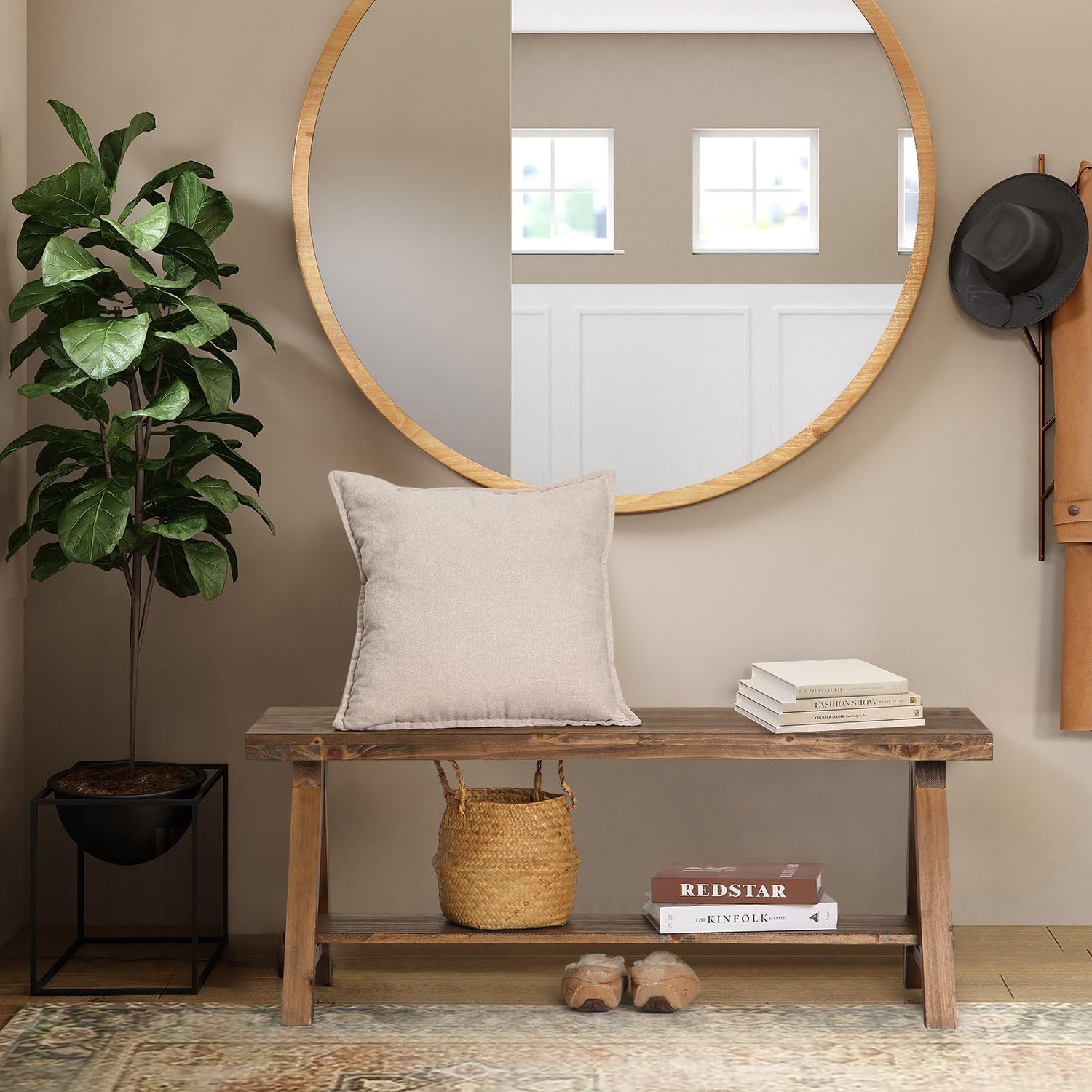 Wnutrees 43" Farmhouse Wood Bench, Long Rustic Indoor Storage Bench for Entryway, Living Room, Dining Room, Solid Wood Construction, Original Wood
