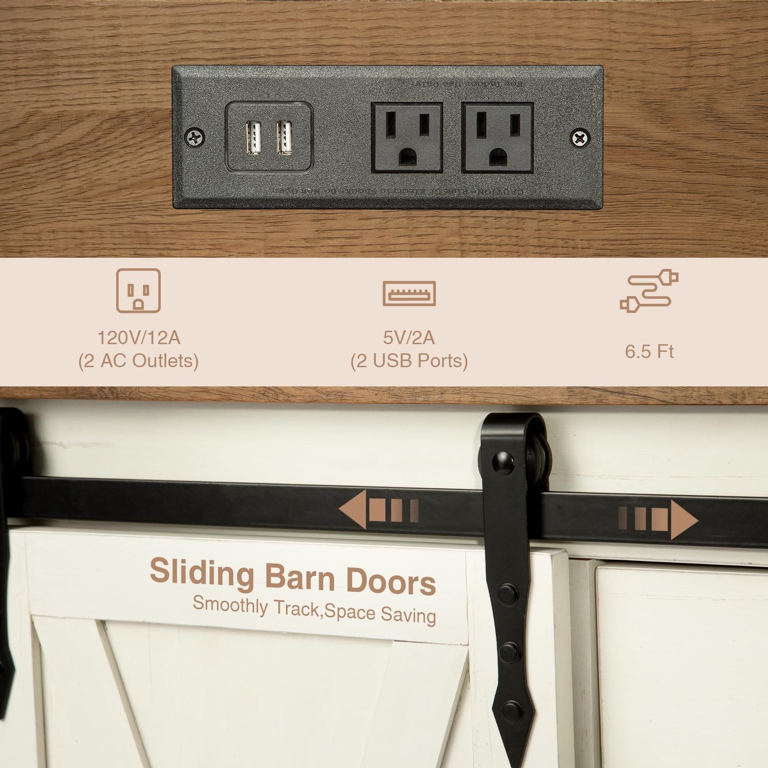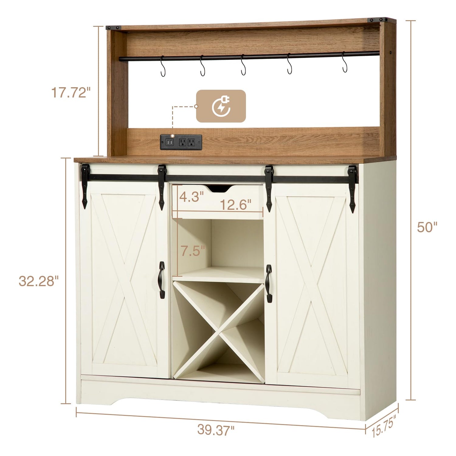Wnutrees Farmhouse Coffee Bar Cabinet with Charging Station and USB Ports,Sliding Barn Door,39" Kitchen Hutch Sideboard Buffet Storage Cabinet,Fits Kitchen Dining Living Room, Antique White