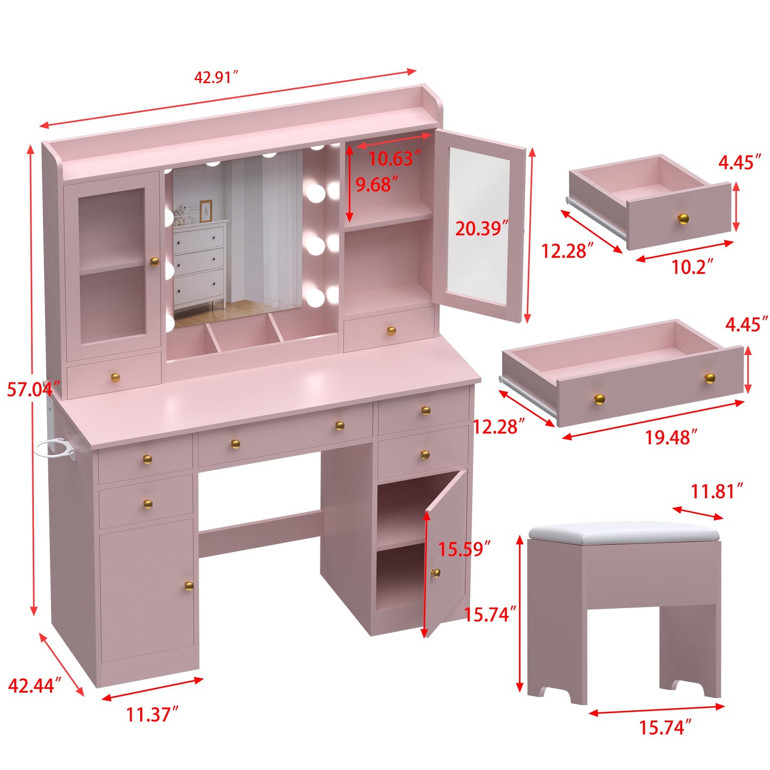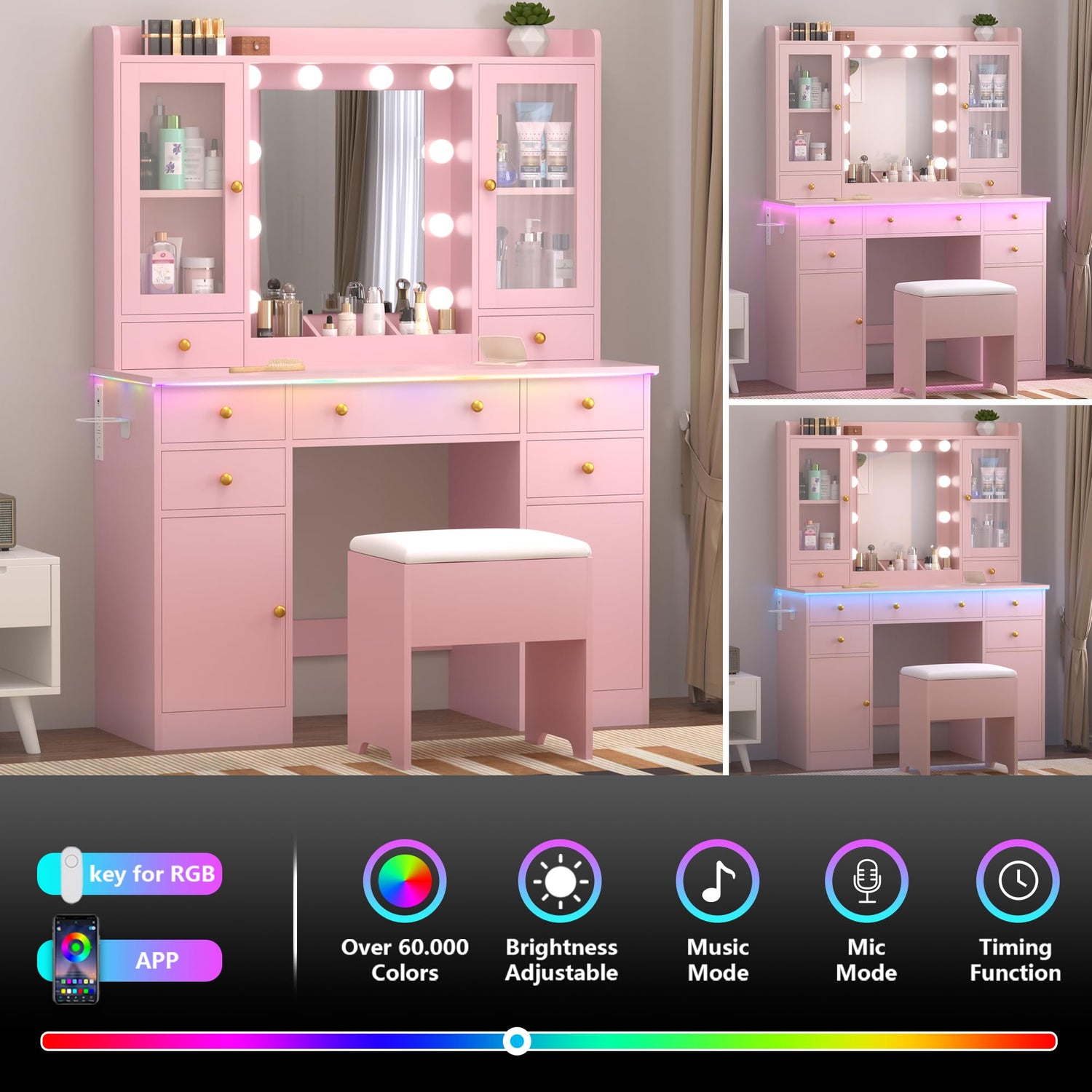 Wodeer Vanity Desk with Lighted Mirror & Power Strip,Makeup Vanity Table with RGB LED Lights & Chair,White Dressing Table Set with 7 Drawers & 2 Cabinet for Girls Women Bedroom & Dressing Room,Pink