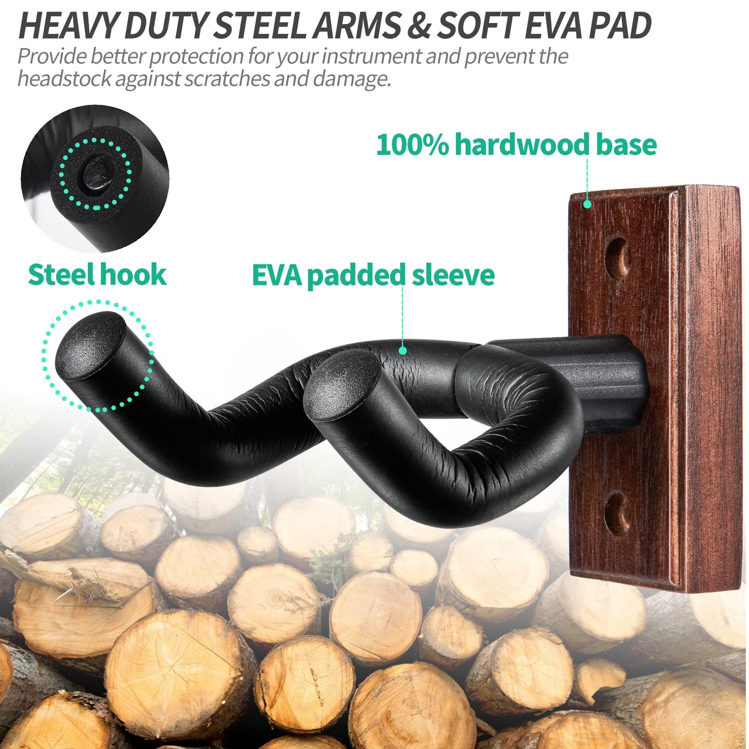 The base is made with high-quality black walnut wood and the steel hook construction with soft silicone pad, this guitar hanger features a heavy duty construction, carrying maximum weight with 30 Lbs, to protect instrument better and can last for many years.