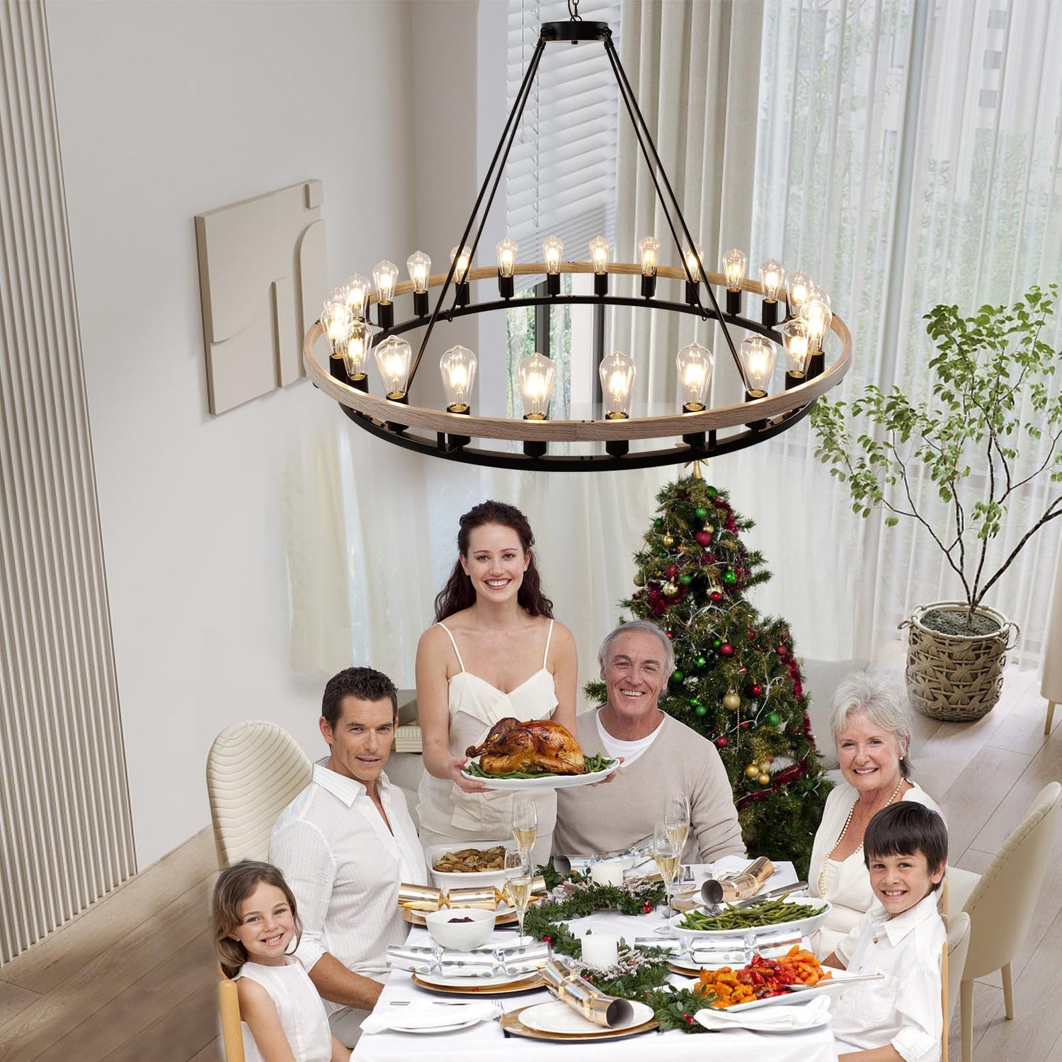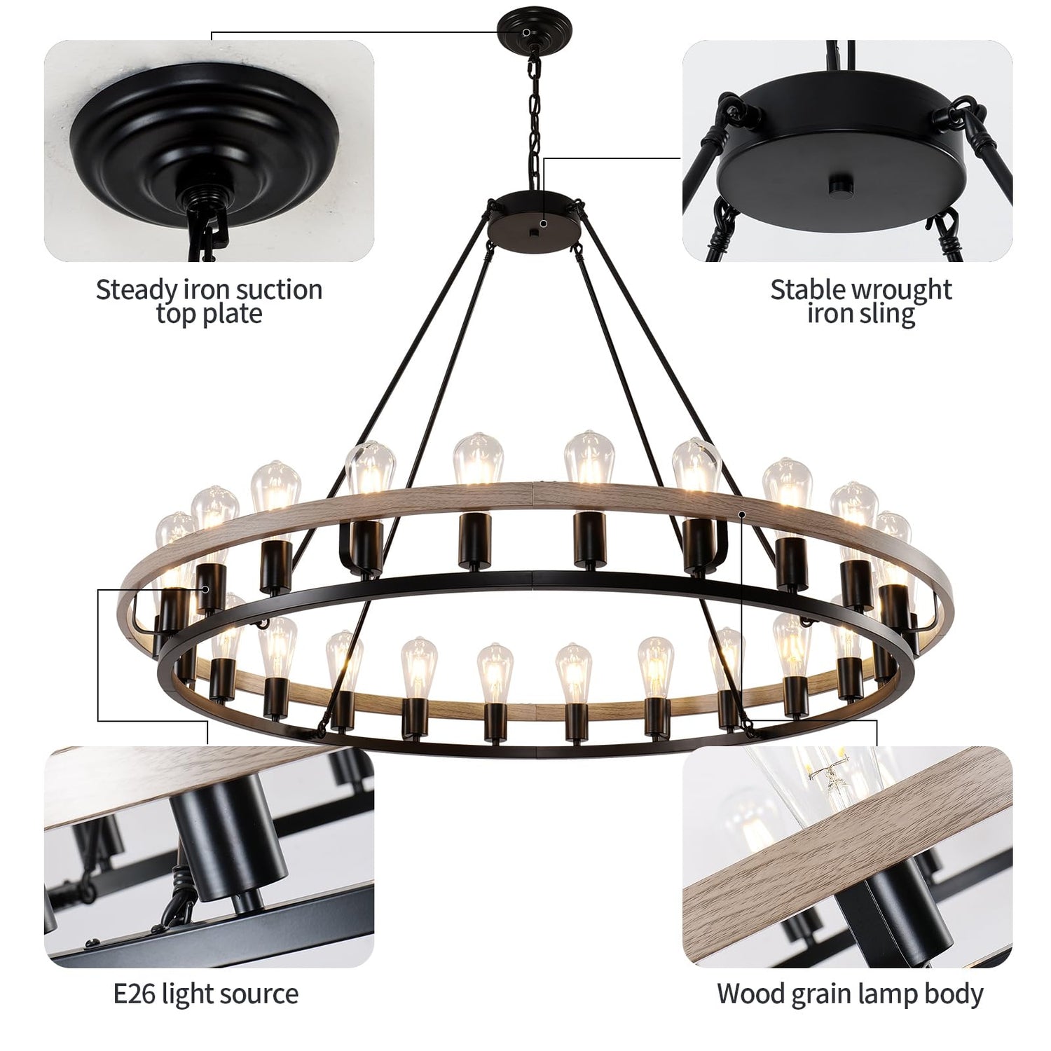 • 【Latest Upgraded Wagon Wheel Chandelier】 The 24-light chandelier are made of durable metal, super solid, NOT REAL WOOD, round black frame with a warm oak wood style finish gives it a classic and charm atmosphere.