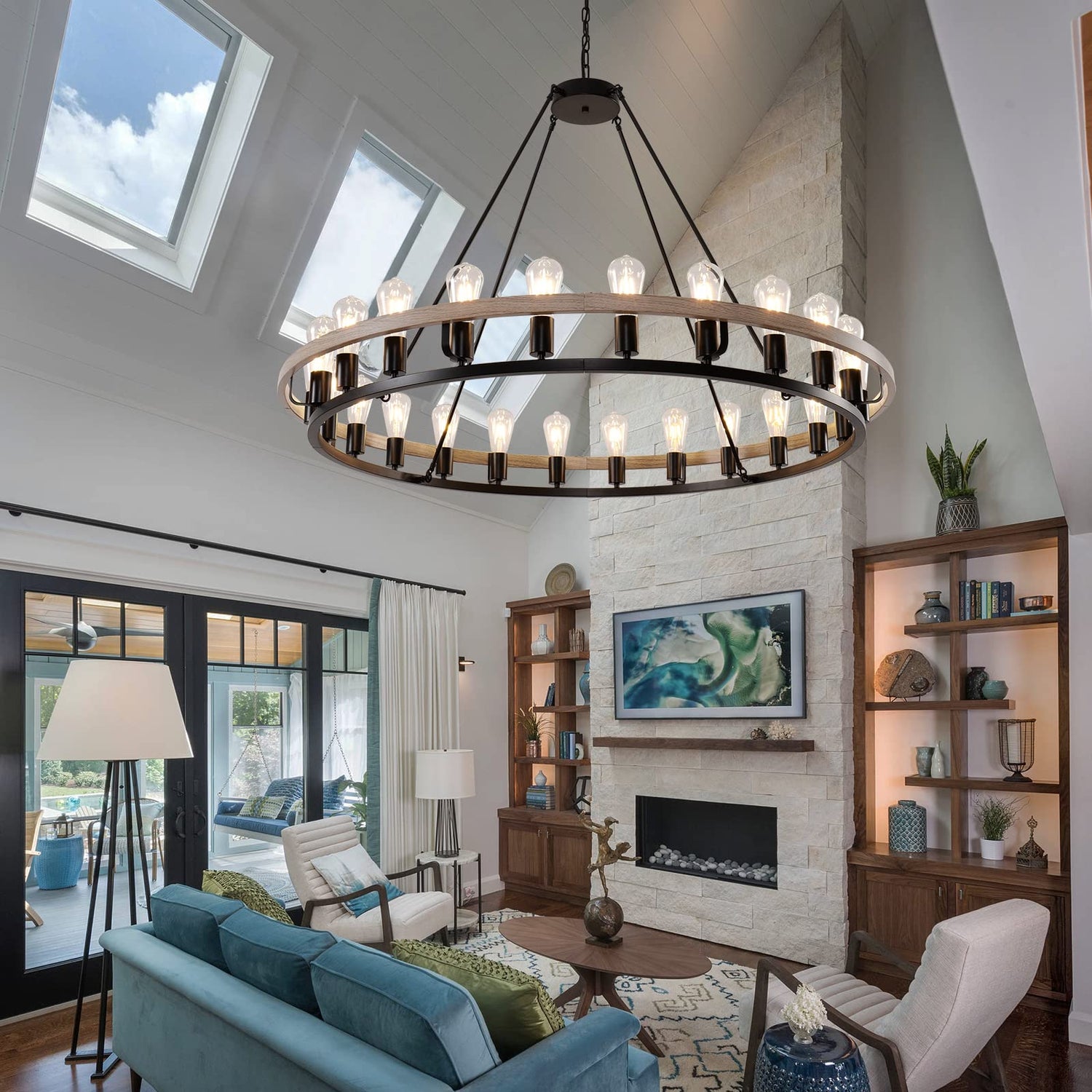 WOGON WEEL Wagon Wheel Chandelier 48-Inch 24-Light, Black and Oak Wood Tone Finish Round Rustic Farmhouse Chandelier Extra Large for High Ceilings, Living Room Foyer