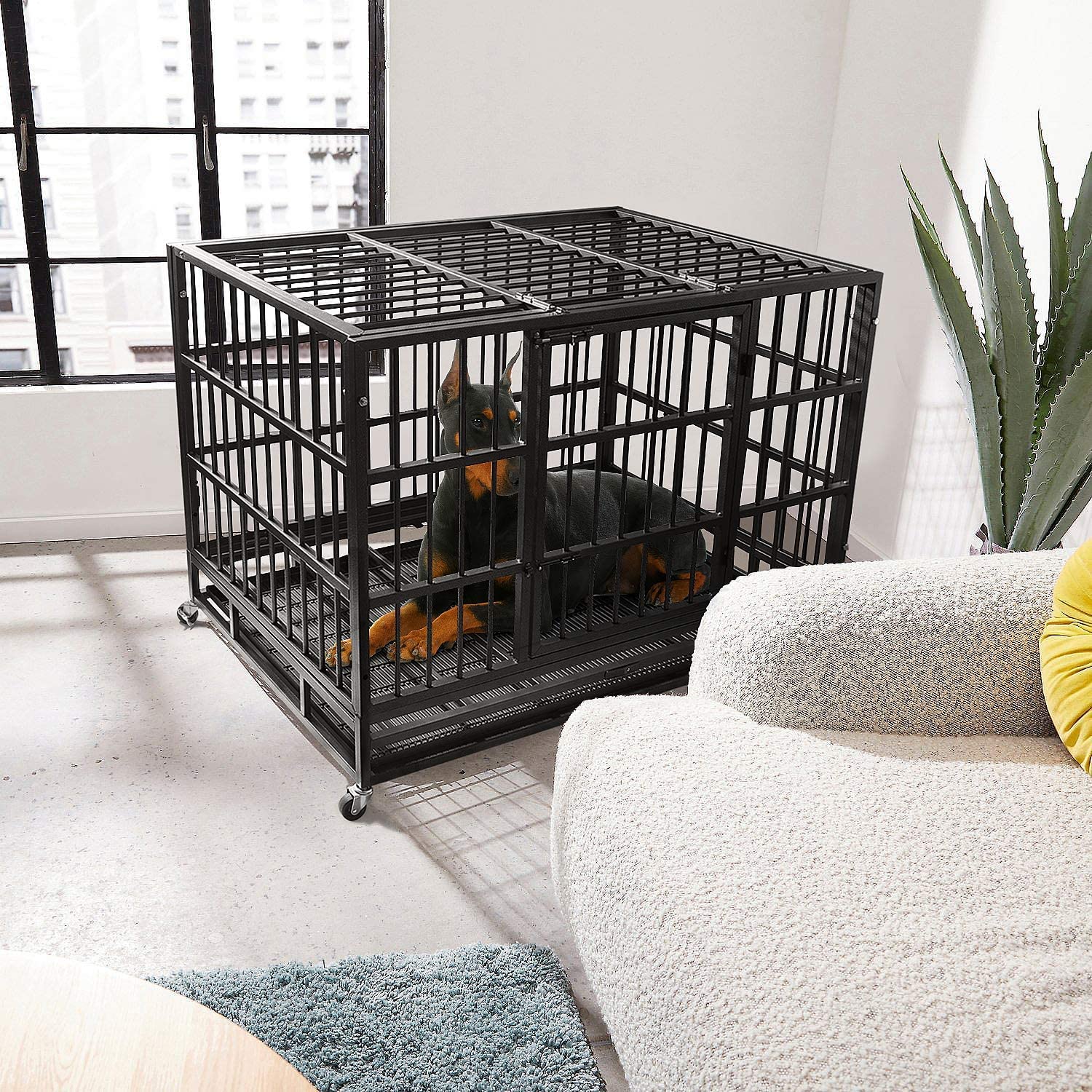 Details: Heavy Duty Dog Crate With fourΒ Wheels, Dog Crates For Large Dogs, Double Door Strong Metal Dog Kennel With Removable Tray.Easily Removable Dog Cage For Travel And Transit. Apply For Indoor&Outdoor..βWhy choose us1.Professionalism ---- We specialize for ten years to produce high quality dog kennels and crates for large dogs,and provide high quality product and best price for each customers.2.QuerePet offers 1 years warranty for refund or replacement of the parts.Please don't hesitate to contact us if you have any question.βProduct FeatureβΒ Upgrade For YourΒ Baby DogΒ Maximized Comfort.β With sturdyΒ design can keep your dog safe.β Simplified installation steps, you can install it all by yourself in 10 minutesβ 360 degree with sturdy rolling swivel wheels and dog kennelΒ can be more flexible in home or outdoor.βΒ Easy to clean:Removable (slide-out) plastic tray helps you to catch the fallen dog food and excrement,and allows you to wipe and clean easily.βΒ Use 20-gauge steel and reinforced 0.5β diameter steel tubes. Much stronger than plastic or fine wire cages.β Non-toxic:Our indestructible dog kennel is the metal frame of treated with a multi-layer hammer-tone coating that helps the crate stand up to rust, corrosion, scuffs and scratches, perfect for indoor and outdoor use.Safe and non-hazardous dog cages protect your pet's health, so you don't have to worry when it chews and licks.βΒ Product Specifications-Β Size: 48 inch-Β Material: Steel-Β Weight: 92 lbs-Β Weight capacity: 350 lbs-Β Internal height: 29.75 "-Β Front door size: 25.4βH x 18.9βW-Β Overall dimension:47.8"L