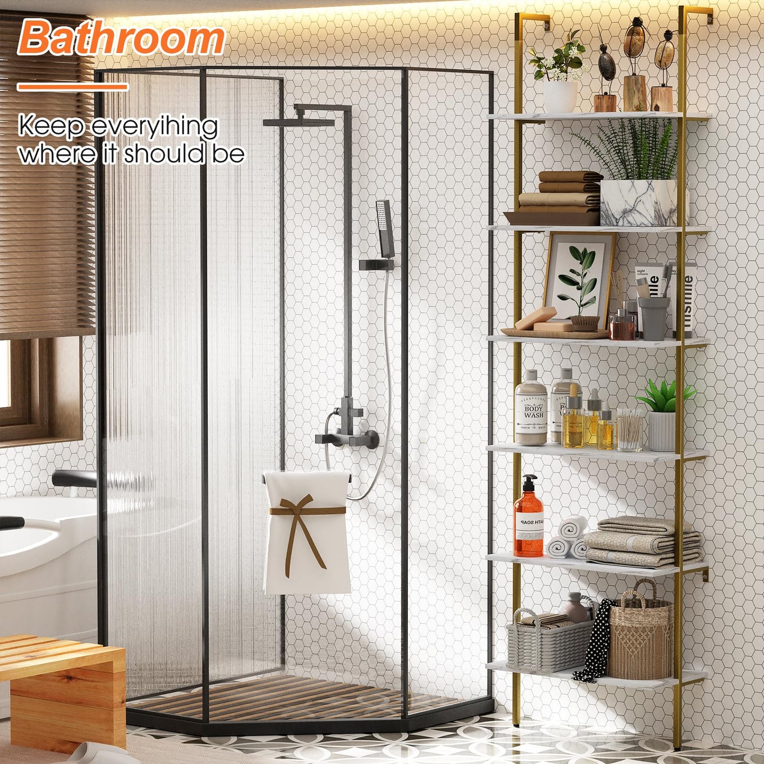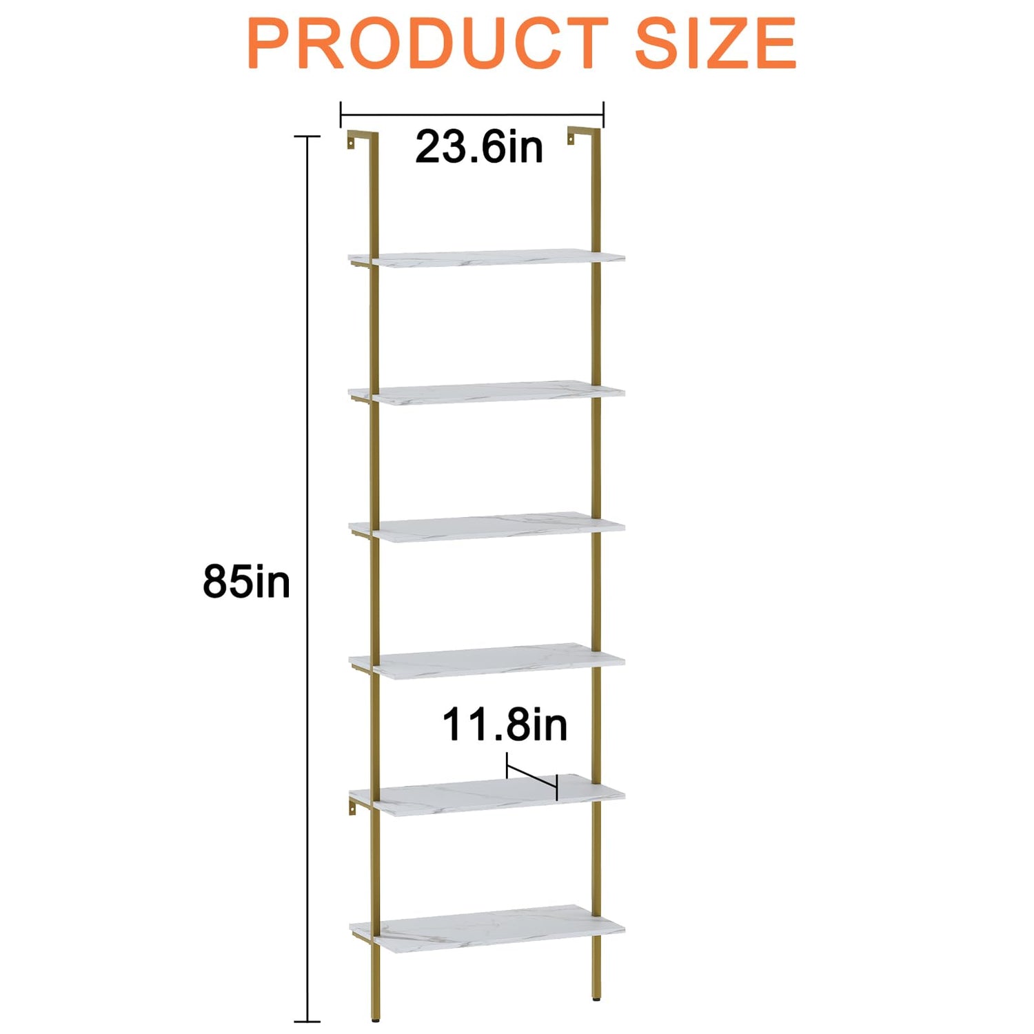Wolawu Ladder Shelf 6 Tiers Marble White Modern Bookshelf Open Tall Wall Mount Bookcase Standing Leaning Wall Shelves Industrial Decorative Living Room Bed Room
