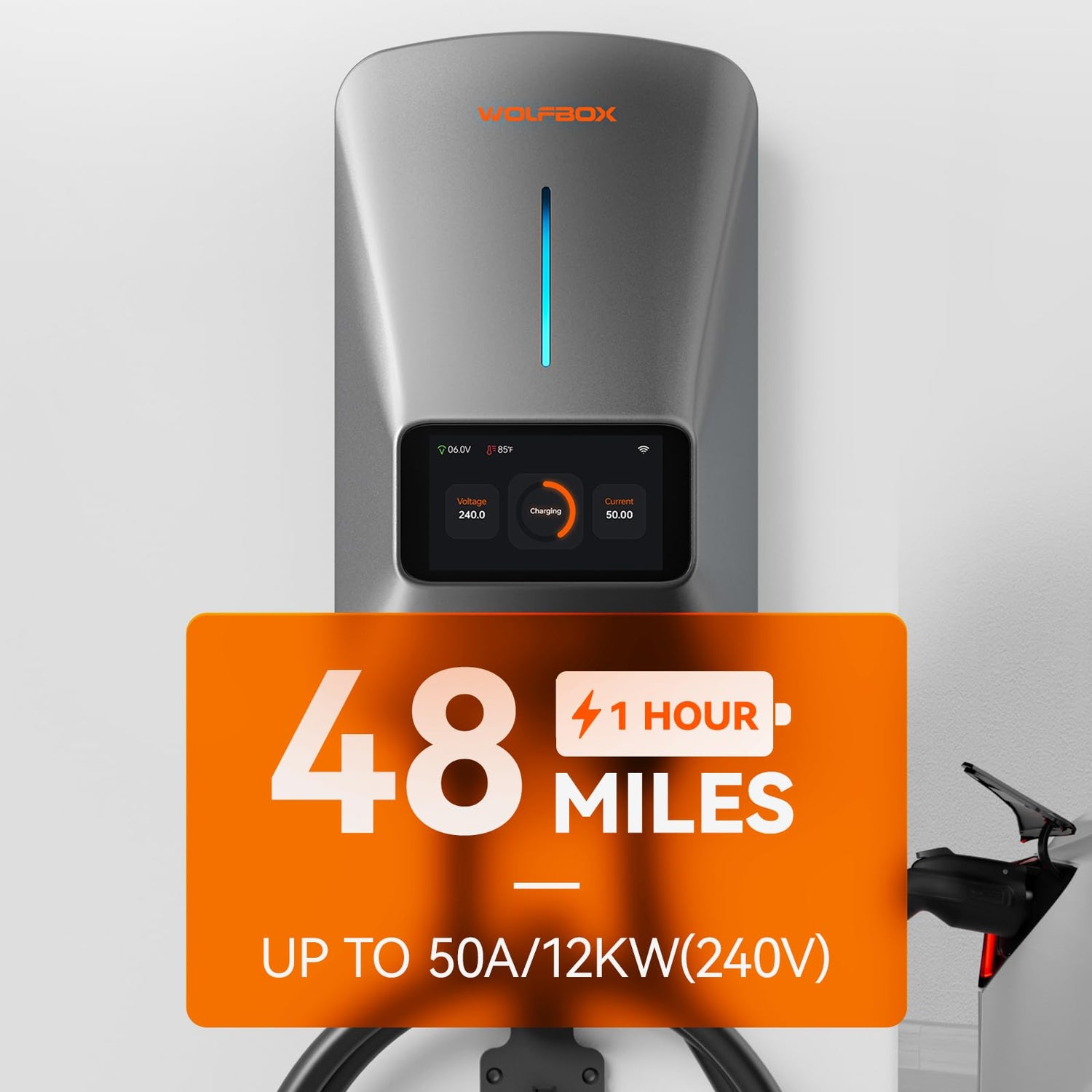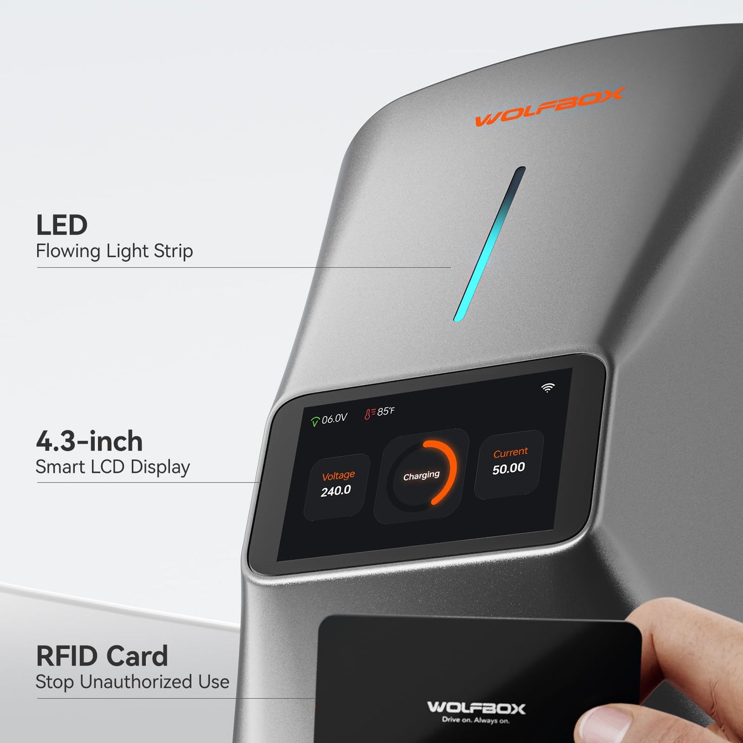 WOLFBOX Level 2 EV Charger 50 Amp - Smart Display, RFID Card, 25ft Cable, Outdoor/Indoor, Hardwired EV Charger Level 2, WiFi Enabled Electric Car Charger, 240V Electric Vehicle Charging Stations