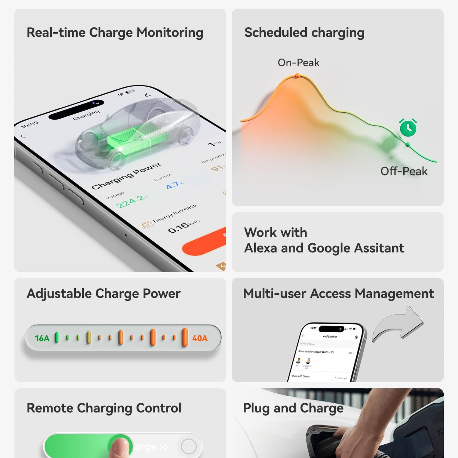 - Faster Charging & Saving More: The electric vehicle charger offers 9X higher speed than level 1 EV chargers, providing an impressive 48 miles of range in just one hour. The EV charger for home supports APP management and Wi-Fi connectivity, you can adjust the current intensity, schedule charging time, and monitor charging data in real-time. Setting a scheduled charging time during off-peak hours lowers electricity bills and saves you money.