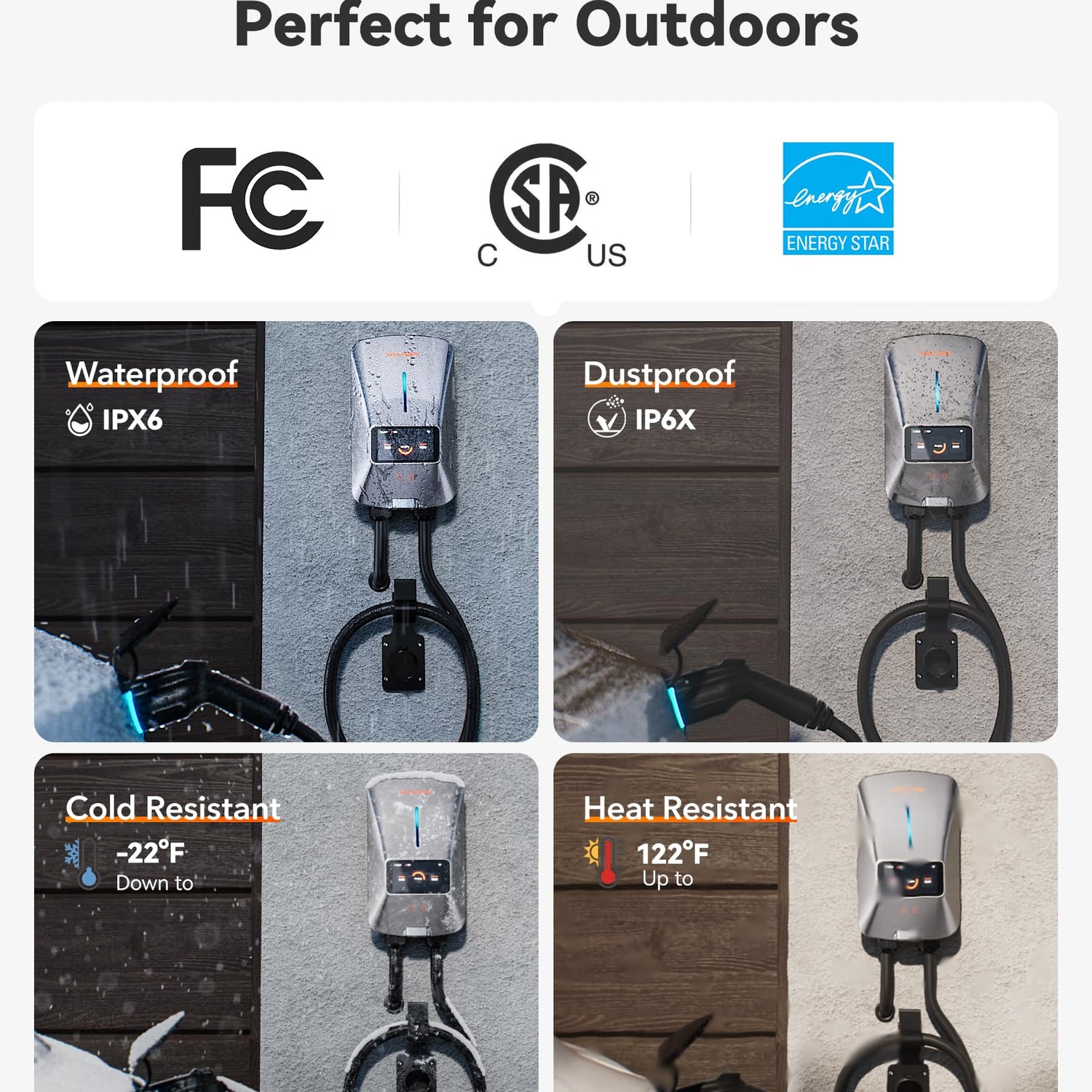 - CSA Certified & NEMA Type 4: The EV car charger is CSA certified and meets UL safety standards(UL2594 standard). The 50 amp EV charger is built with robust NEMA 4X waterproof protective housing, making it resilient to external influences. It comes with a 25ft premium cable, giving you peace of mind when charging in all weather conditions.