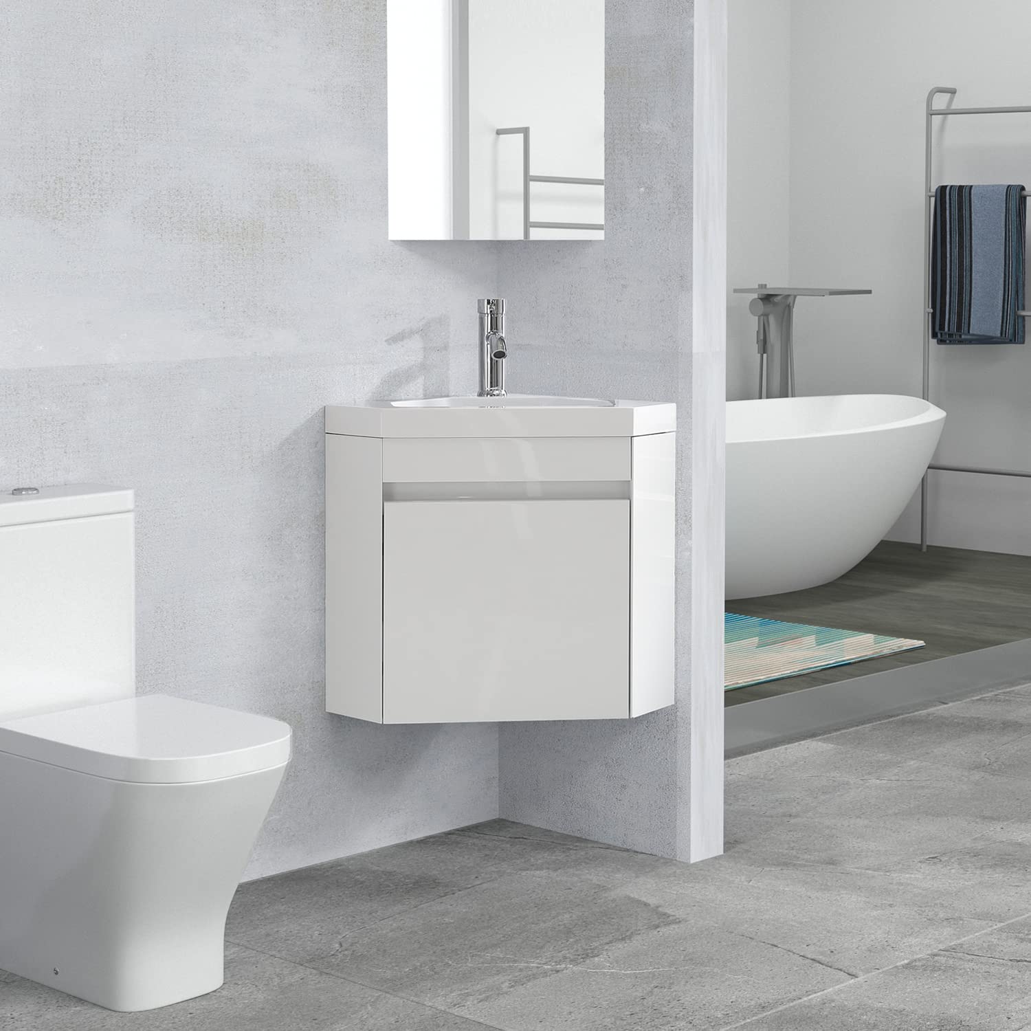 wonline 16" Corner Bathroom Vanity Sink Combo for Small Space Wall Mounted Cabinet Set Design White Resin Basin Sink Top Chrome Faucet and Drain