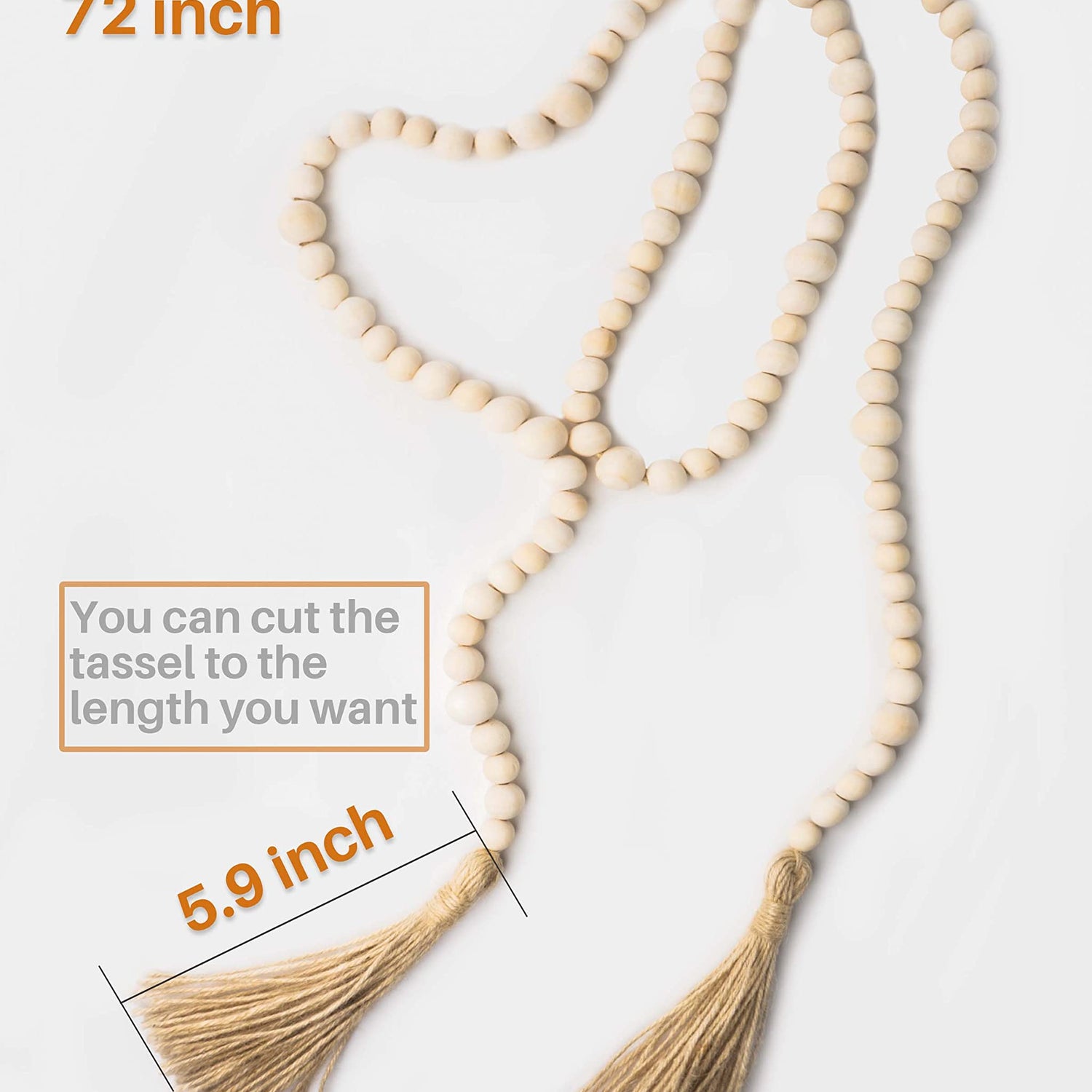 The total length of beaded garland is 71 inches including 59-inch wood beads and 2 pcs 6-inch tassels, if you like shorter tassels, you can cut them to the length you like.