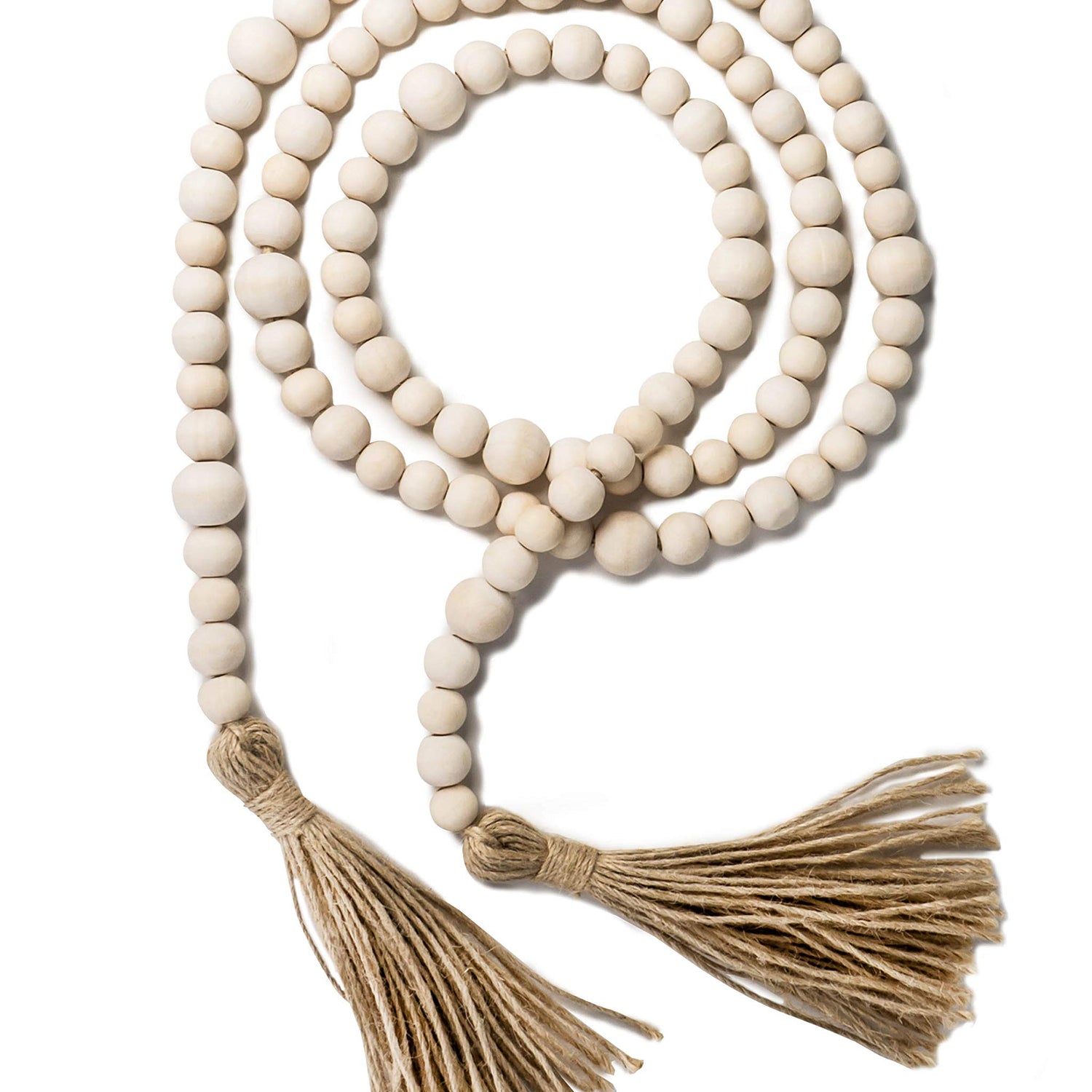 Package Contents: A 71-inch wood bead garland with 2 tassels A 3-inch diameter blank wood circle