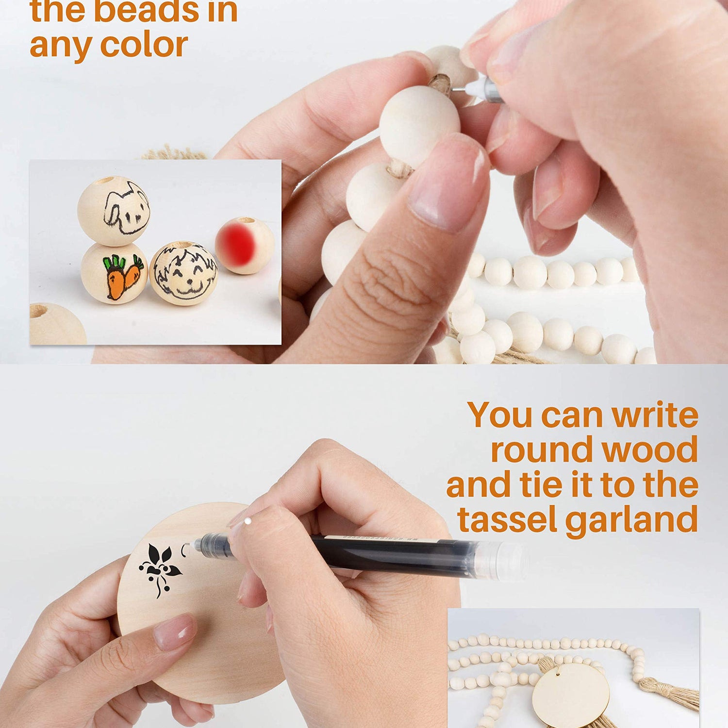 There is a 3-inch diameter blank wood circle in the package, you can write or paint on it and tie it to the tassel garland for your special wooded garland beads.