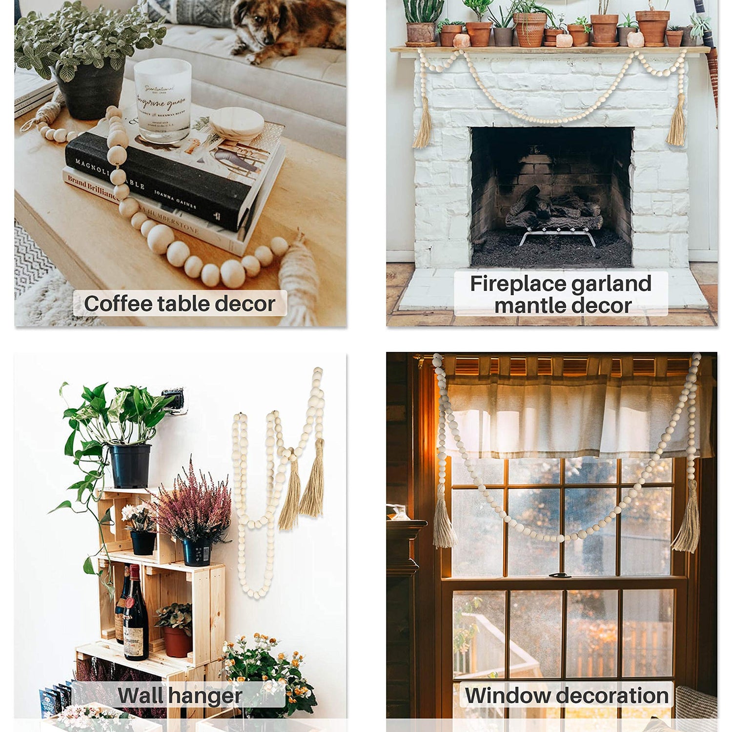 - DECORATION: the wood beads garland can be coffee table decor, bookshelf decor, fireplace garland mantle decor, draped around plant pots, candle holders or as a wall hanger