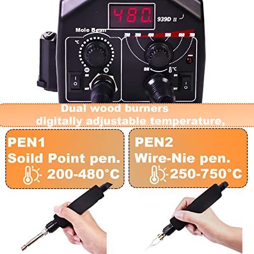 • ✪【Precise Temperature Control】: Wood burner equipped with a digital display with adjustable temperature, providing precise temperature adjustment for different projects, the temperature adjustable range of Pen 1 is 250~750°C, and the temperature adjustable range of Pen 2 is 200~480°C. Add water to the included sponge to help cool and clean the tip.