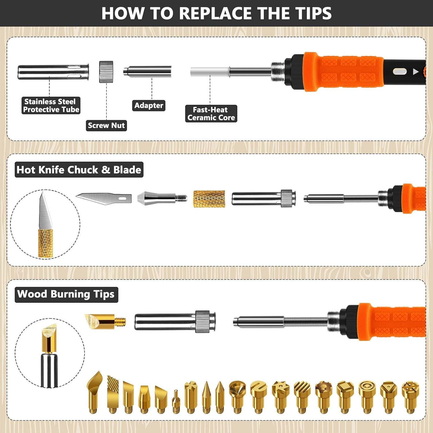 - 【Versatile Replacement Tips】The wood burning craft kit includes 22 different replacement tips(20 different patterns), enabling you to tackle any project with ease. Whether you're engraving fine details or broader strokes, these tips will support your creativity and expand your artistic capabilities, catering to both beginners and professional artists.