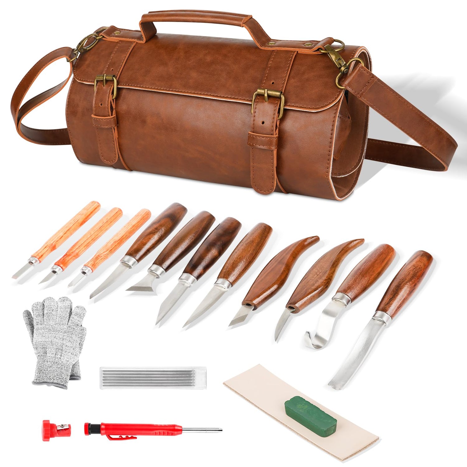 Wood Carving Tools Sets Deluxe Wood Carving Kit Wooden Carving Knife Wood working Carving Knife Tools Set with Large Leather Case For Beginner and Carpenter Experts