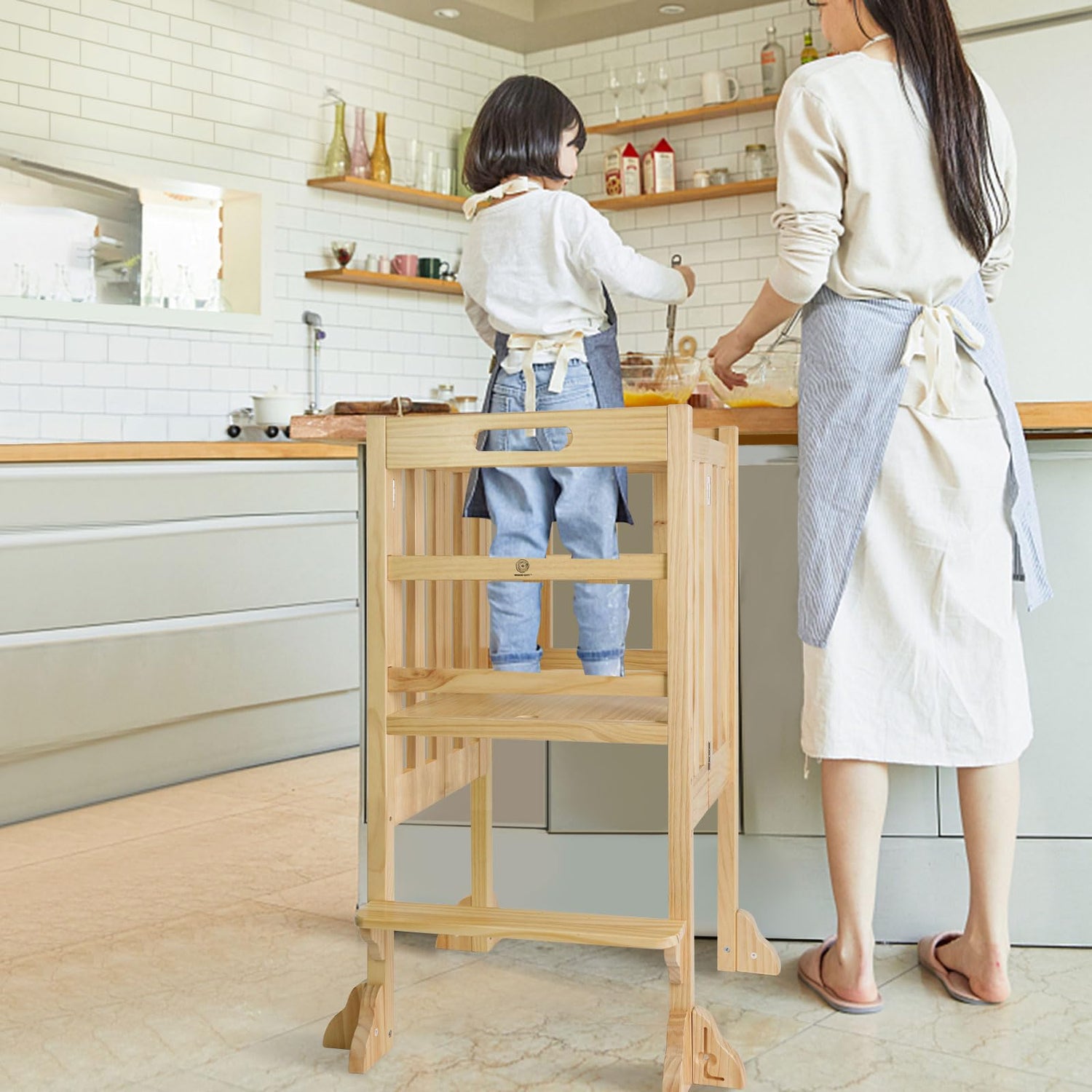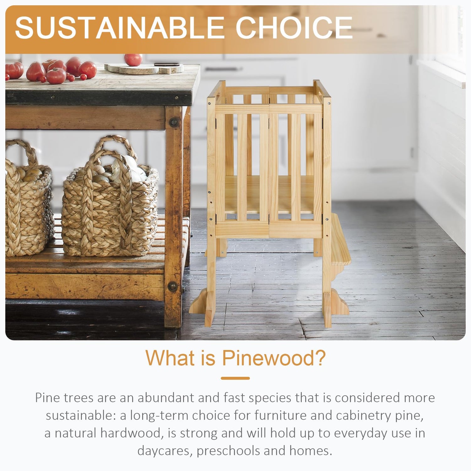 - 100% PINE WOOD: This durable stool is made from 100% pure pine wood with a child-safe, non-toxic finish. This toddler standing stool is very space-efficient due to its folding design. You can put this toddler kitchen stool away in the corner when you don't need it