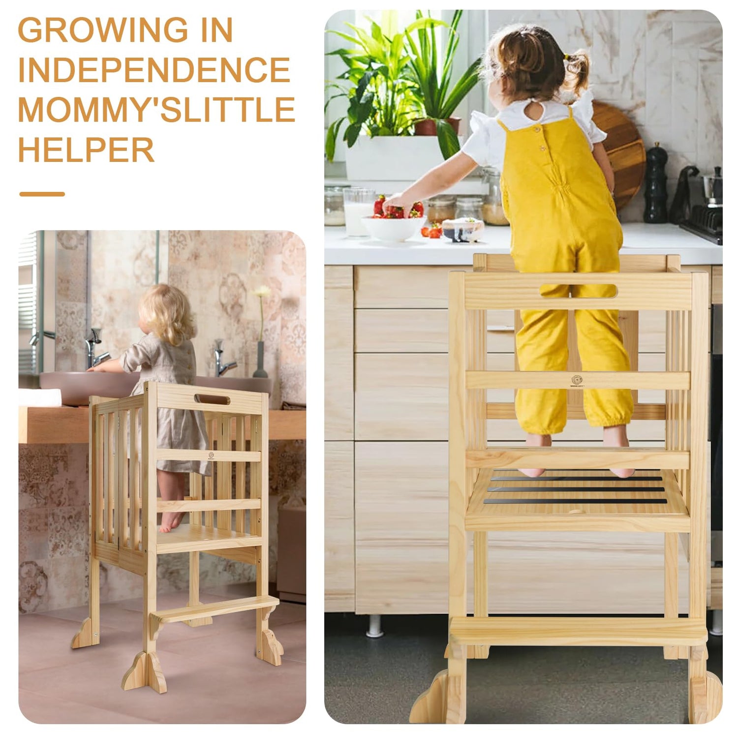 WOOD CITY Kitchen Step Stool Helper - Montessori Foldable Standing Tower for Toddlers with Safety Rail, Height Adjustable Ideal Helper for Learning New Skills, Natural Pure Pine Wood (Natural)
