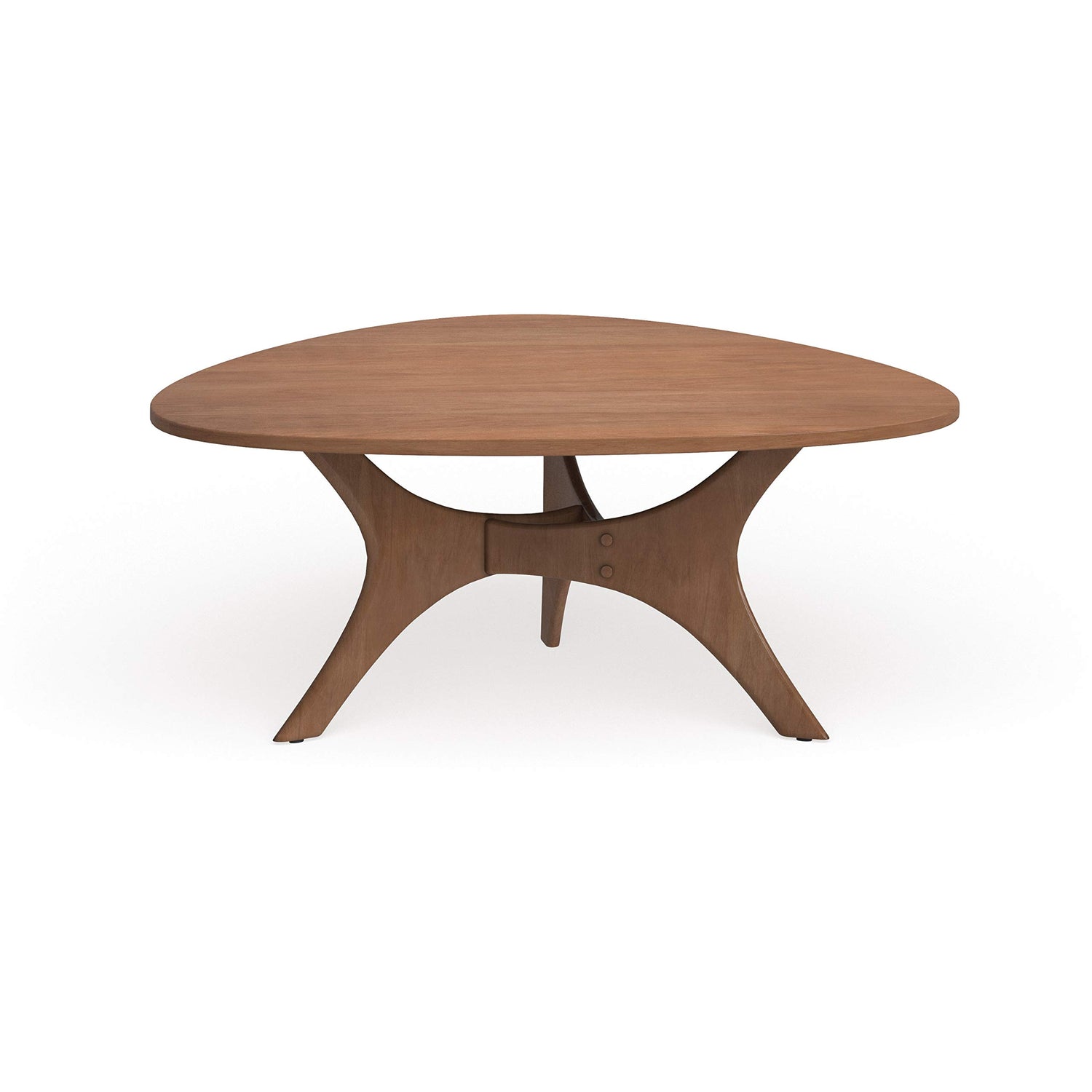 - Solid rubberwood base. MDF and birch veneer table top. Mid-century modern Design/Look. Pecan finish. Triangular shape. Flared legs. Wipe with a soft, dry cloth. Requires assembly. Design/Look : Mid-Century Modern. Material : Wood. Type : Coffee Tables. Finish : Wood Finish. Frame material : Rubberwood. Assembly : Assembly Required. Base type : Legs. Color : Brown. Design : Table. Shape : Triangle. Top material : MDF, Veneer. Product Size: : 17