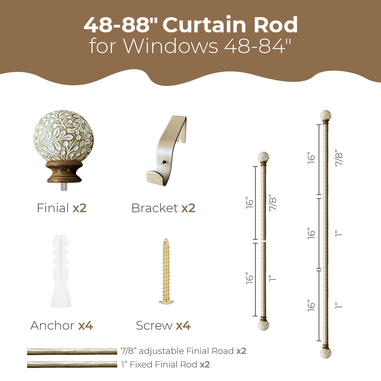 - *LDSP Curtain Rods for window 48 to 84 inches (4- 7ft): Brown drapery rods include 2 x16" x 1 fixed rods, 2 x 16x 7/8 adjustable rods, 2 x imitation wood grain finish 2 x bracket, 2 x connector, 4 x anchor, 4 x screw. Brown curtain rods according to length of your window.