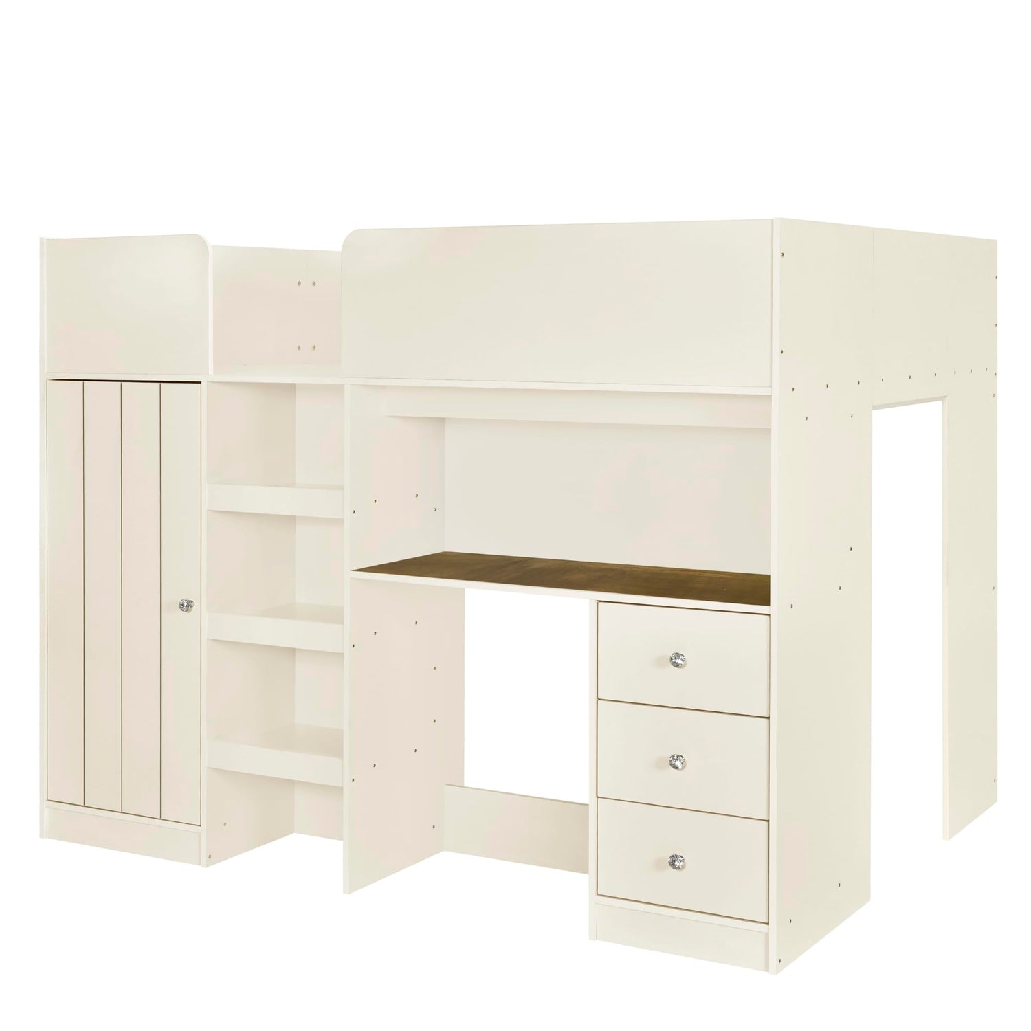 This loft bed is made of pinewood and MDF board, which has good stability and safety and can withstand high-weight play without dangerous swings. Equipped with wardrobe underneath the bed, storage shelves and 3 drawers add storage functions. The 39.4'' x 15.4'' desk provides you with a place to work or do homework.