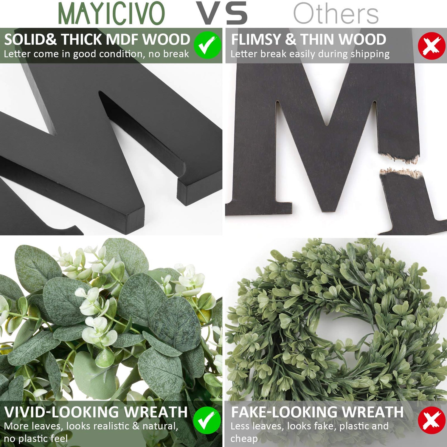 - GORGEOUS & CHANGEABLE HOME DECORATION: Welcome your guests with MAYICIVO Decorative Wood Home Sign for Wall Decor with Artificial Eucalyptus wreath, bringing a comfortable, welcoming and warm atmosphere to your home. Perfect home accessories. If you love to decorate for the season you can just change out the wreath with a seasonal one, festival one, a clock, etc. Perfect for all season and all holidays, such as spring, summer, fall, winter, birthday, Christmas, Anniversary, etc.