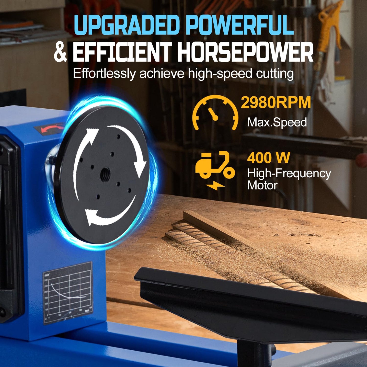 - Powerful Motor: Equipped with a 400W high-frequency motor, our wood lathe offers a maximum speed of 2600RPM. You can easily perform high-speed cutting and planing on bench wood lathe, which improves work efficiency and processing quality