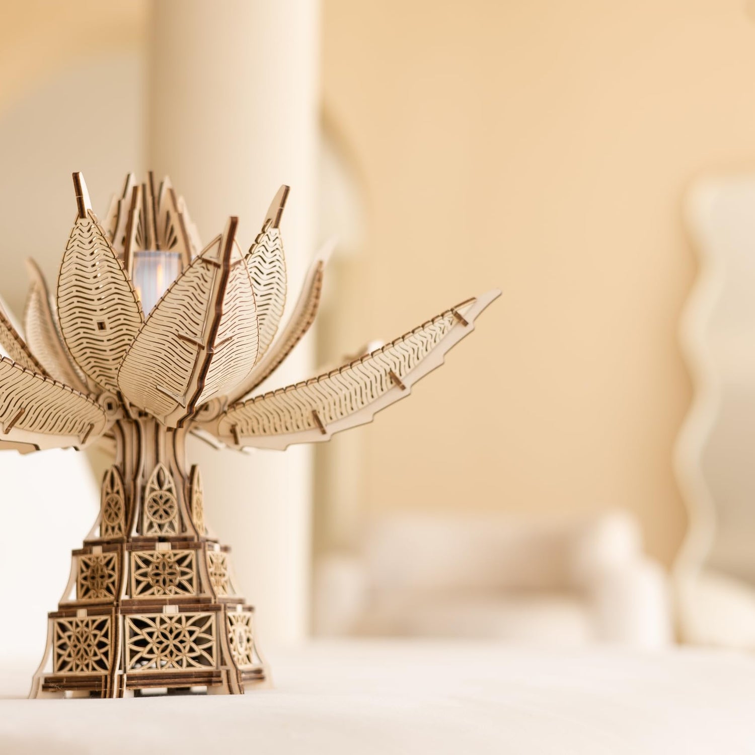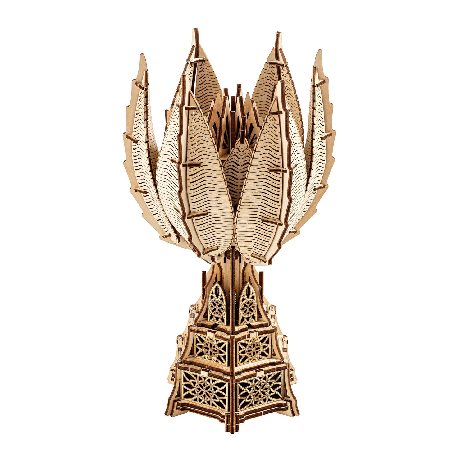 - NATURAL WOOD - Fiery Bloom is a detailed model building kit made entirely of wood. Put together 246 pieces and create a stylish table lamp in the shape of a flower. This mechanical puzzle comes with an illustrated step-by-step assembly guide and requires no glue for full assembly. Dimensions: 15.75*12.99*15.75 in