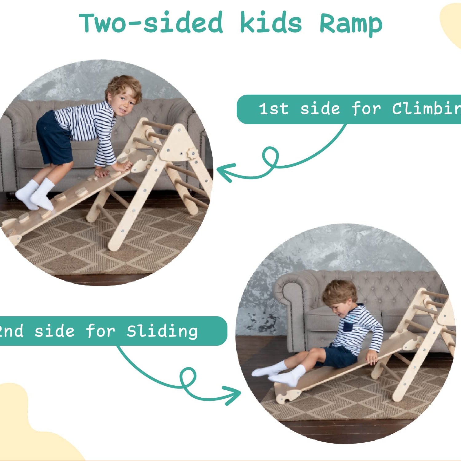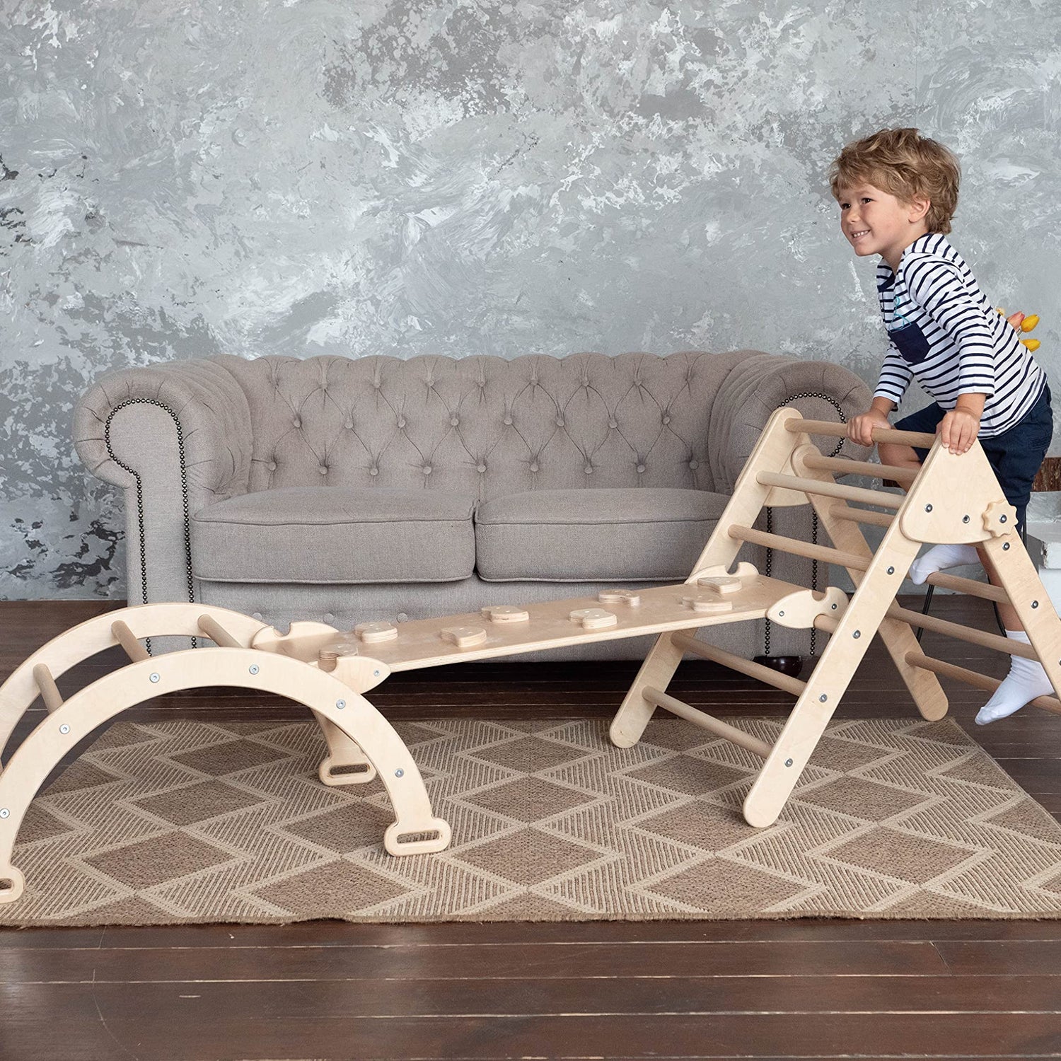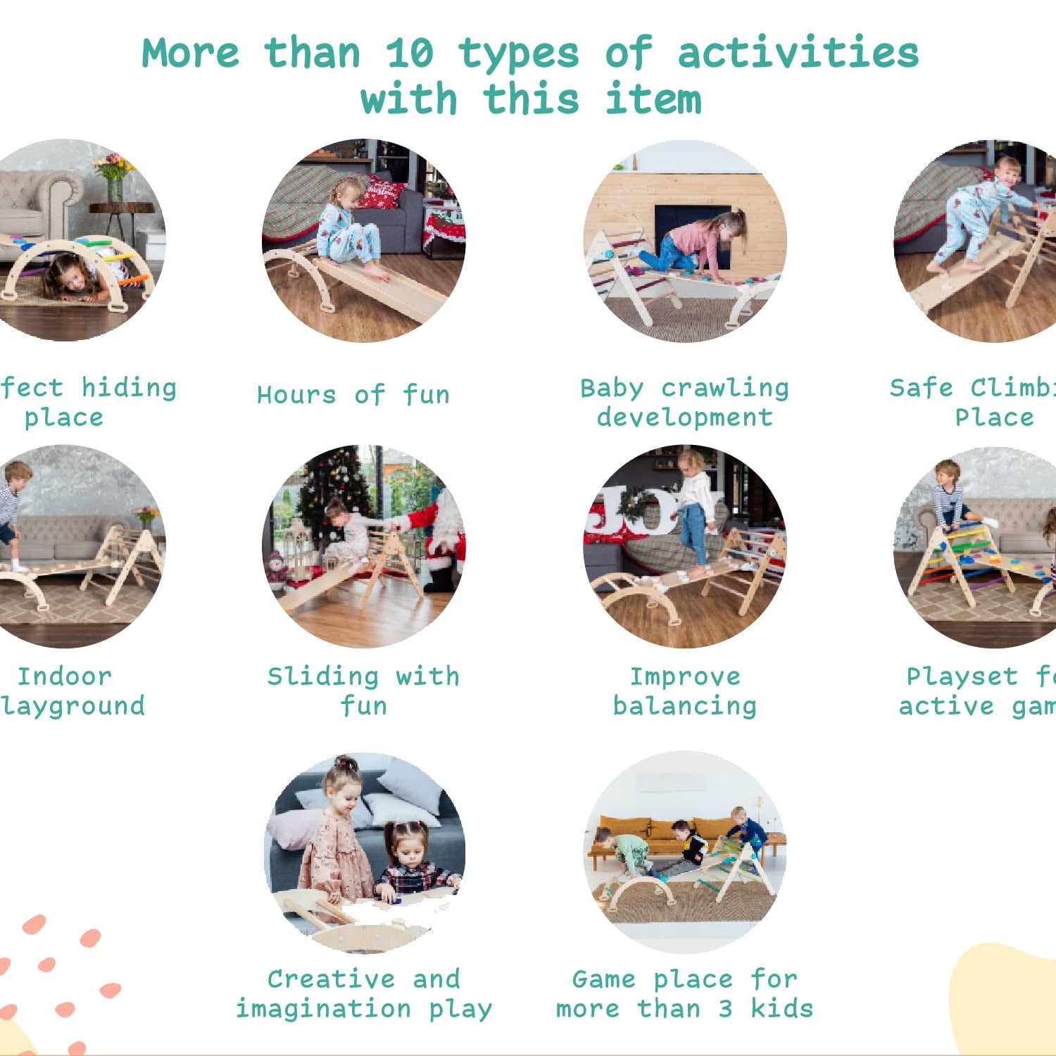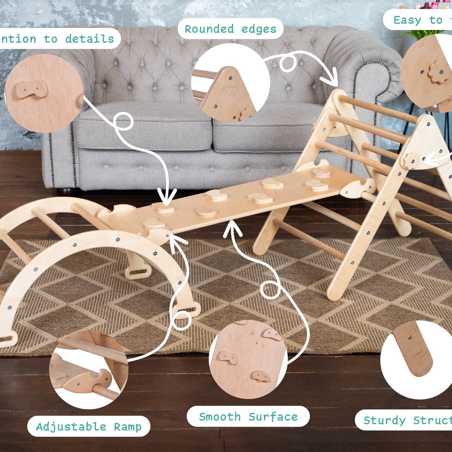 • Perfect movement development toy for kids and toddlers. The Small Size furniture is designed for children from 8 months to 4 years. This perfect set has three different goods arch, ramp and triangle climber. So your children can choose which one they want to use.