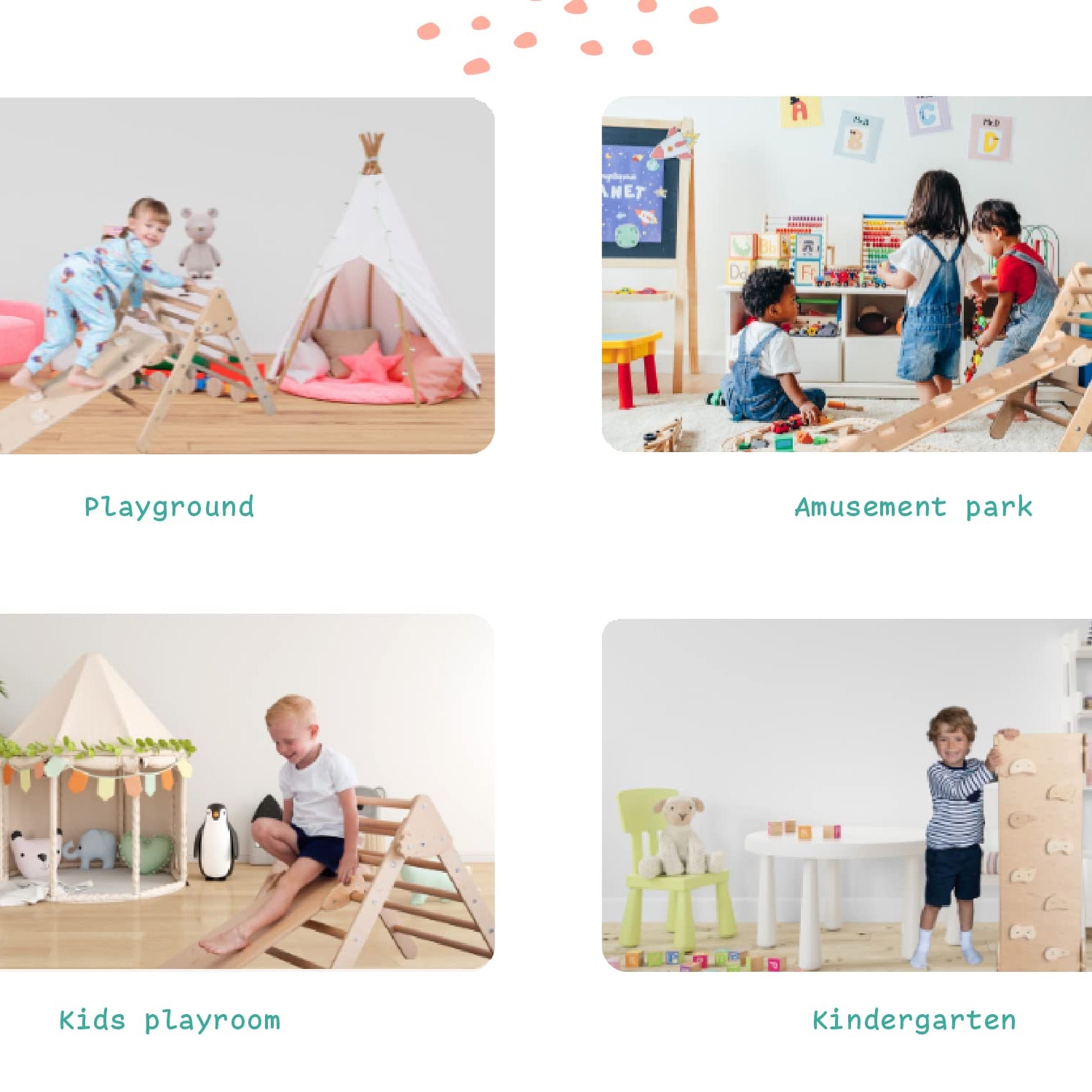 • Inspired by the principles of Montessori education, our climbing toys encourage children to develop motor skills, spatial awareness, and confidence in their abilities. The Pikler Climbing Set, a central piece of this indoor playground, promotes natural movement and physical engagement, fostering both physical and cognitive development.