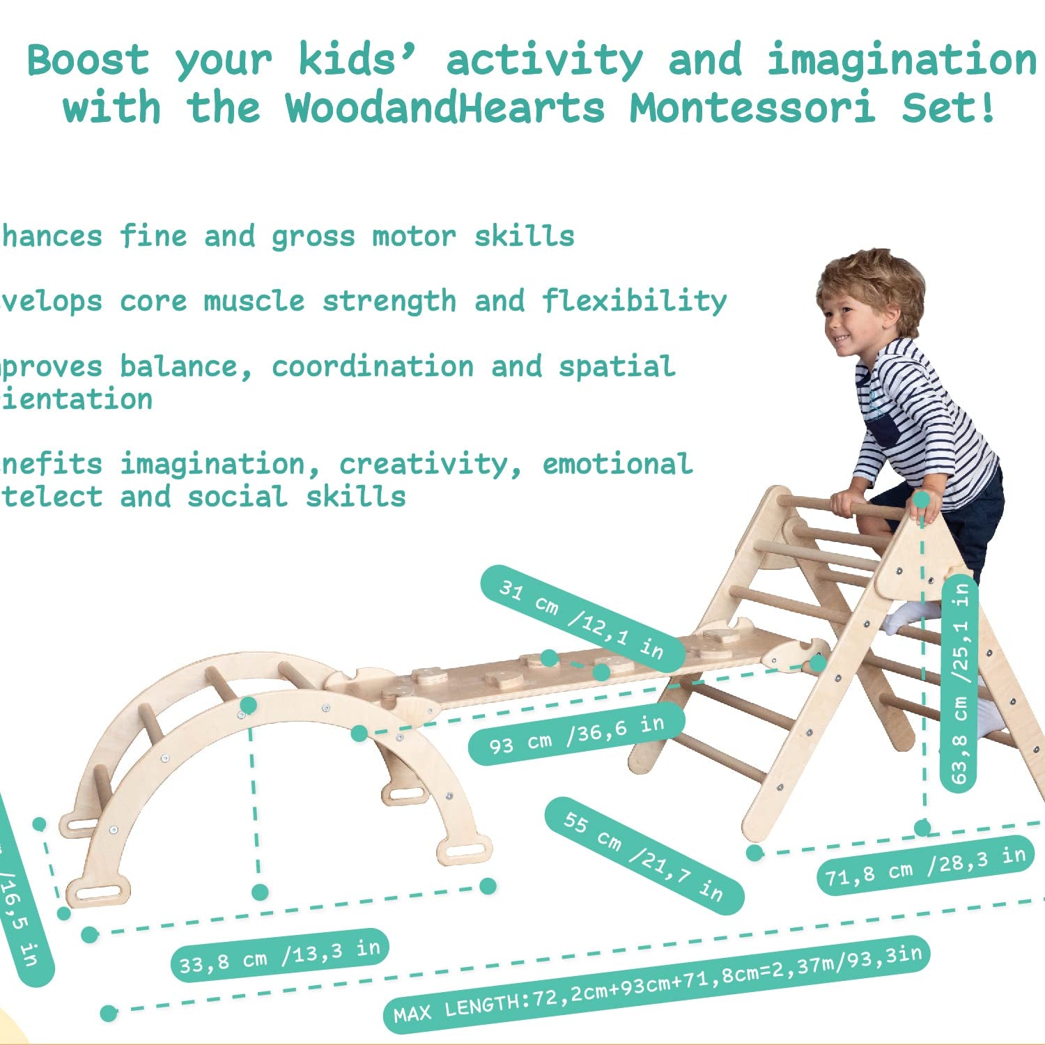• Say goodbye to rainy days and boring afternoons with our Woodandhearts Montessori Climbing Set. Transform any room into a vibrant Jungle Gym where little ones can explore, discover, and grow. Invest in their development and create memories that will last a lifetime with our baby indoor playground.