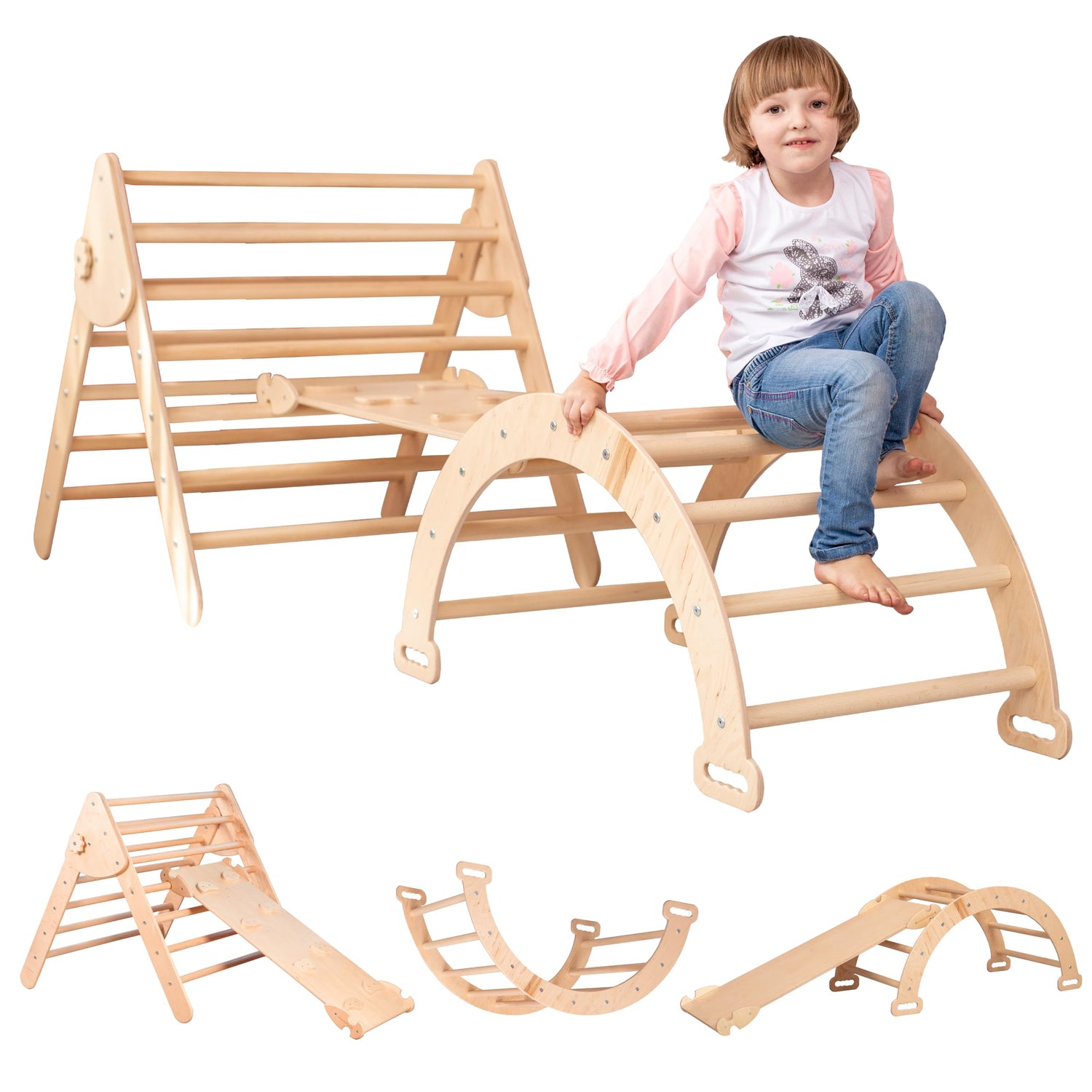 - A pikler triangle set large Montessori set helps children develop their motor skills by strengthening the arms, legs, and trunk muscles. Also, classes on the children's indoor play set help to improve body coordination, motor reactions, and flexibility.