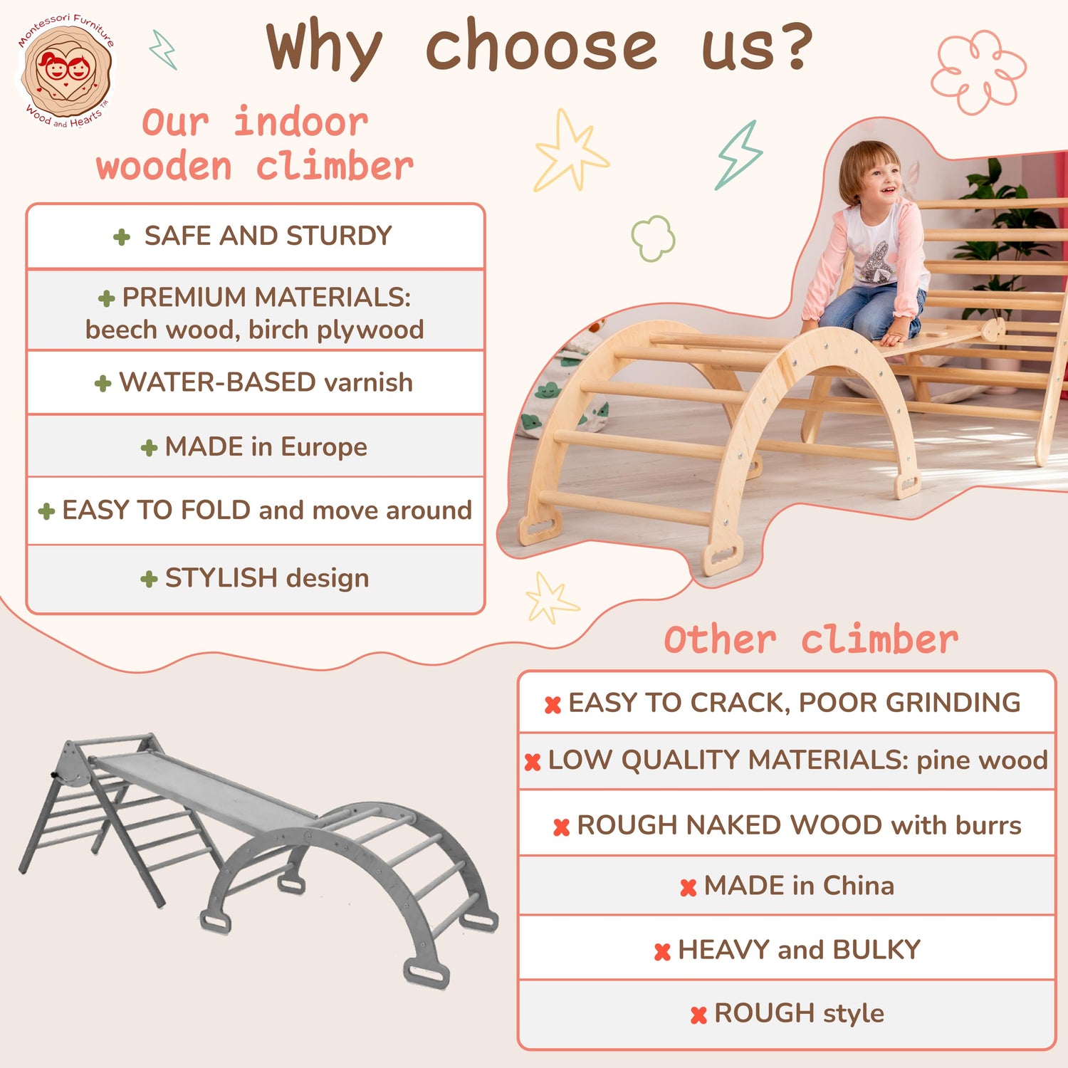 - Montessori baby climbing structure helps children to develop the perception of space, understanding of distances, height, the concept of geometric shapes, and other concepts that are perceived easily and playfully.