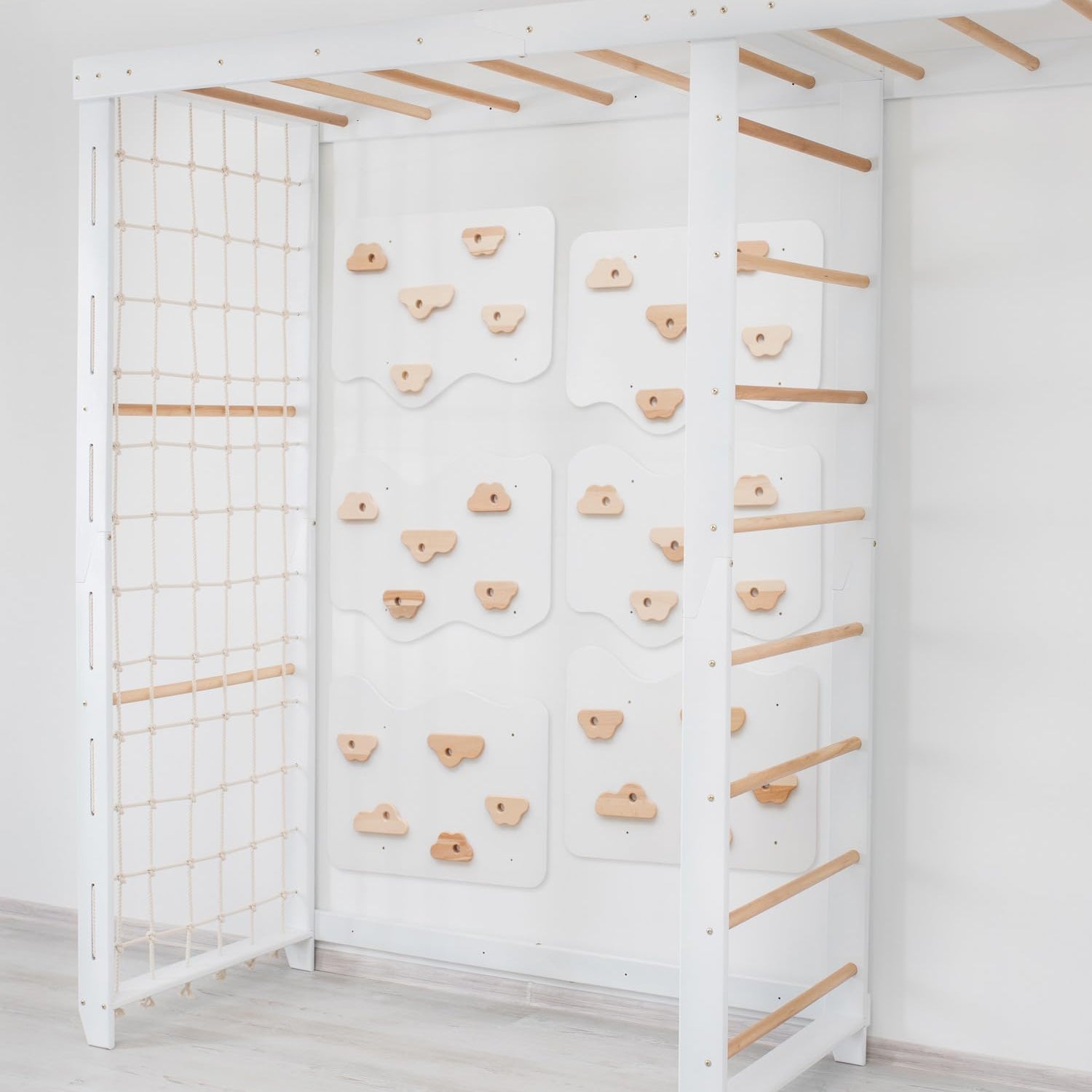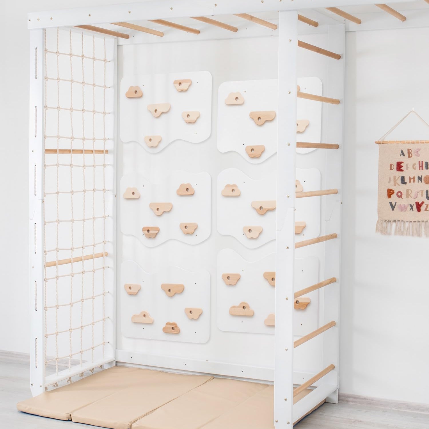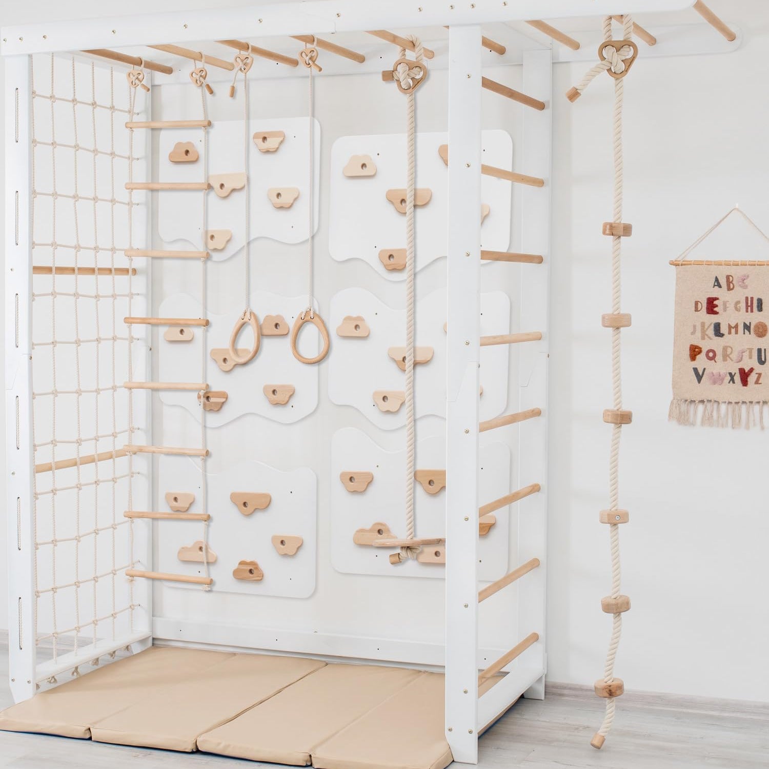 - Climbing kids’ wall is a unique indoor playground that will help your little ones grow up healthy, agile, and strong. This Montessori climbing set combines a variety of activities: climbing the ladder walls, improving motor skills and coordination on the asymmetrical triangular ladder, using gymnastic bars or a rope with 5 spheres, or riding on a rope with a round wooden seat. It's a fun game, quality active leisure, and beneficial exercise for various muscle groups.